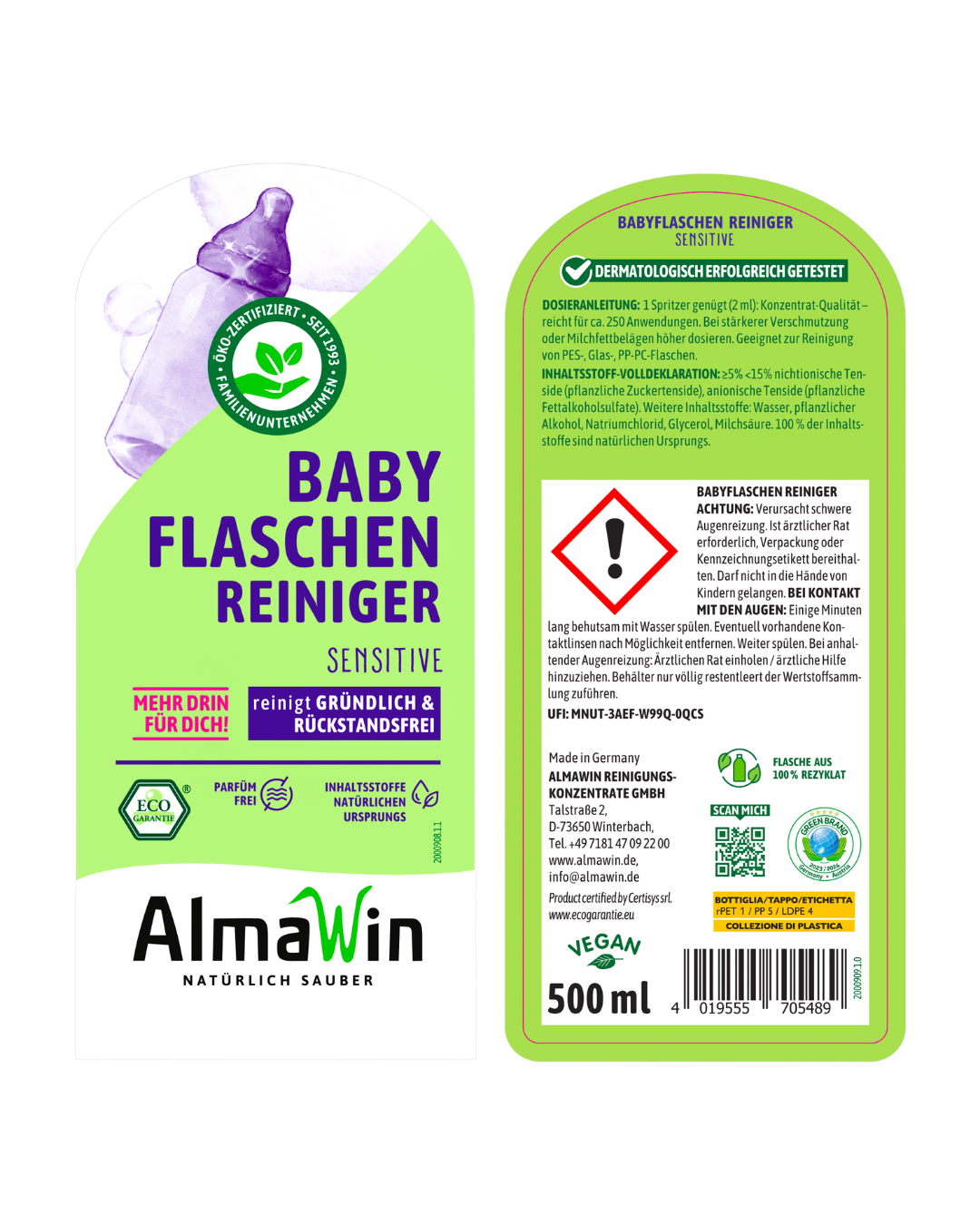 AlmaWin BABYFLASCHENREINIGER: ACHTUNG: Verursacht schwere Augenreizung. Ist ärztlicher Rat erforderlich, Verpackung oder Kennzeichnungsetikett bereithalten. Darf nicht in die Hände von Kindern gelangen. BEI KONTAKT MIT DEN AUGEN: Einige Minuten lang behutsam mit Wasser spülen. Eventuell vorhandene Kontaktlinsen nach Möglichkeit entfernen. Weiter spülen. Bei anhaltender Augenreizung: Ärztlichen Rat einholen/ärztliche Hilfe hinzuziehen. Behälter nur völlig restentleert der Wertstoffsammlung zuführ