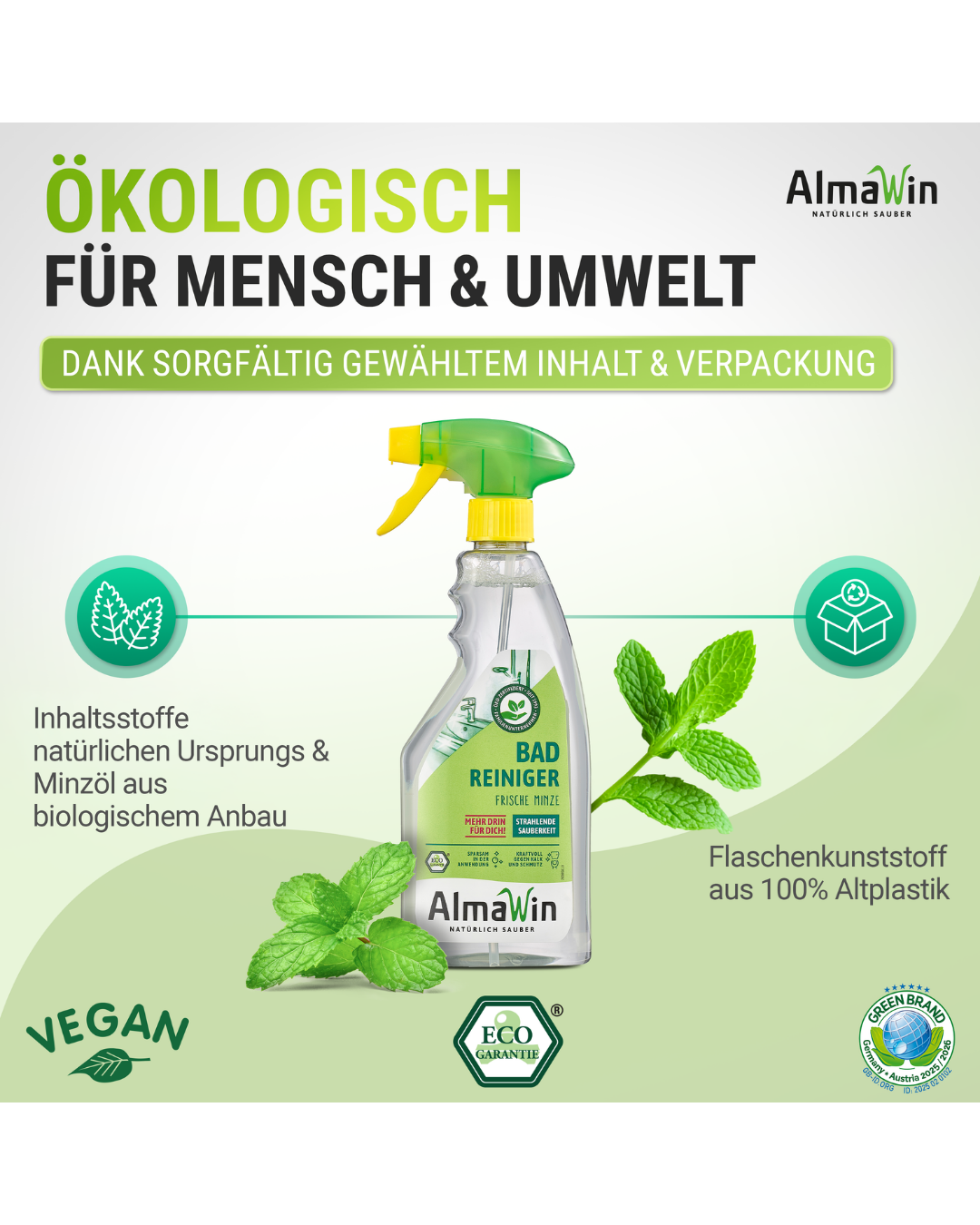 Ich bin ein Umweltheld! Meine Flasche besteht aus 100 % recyceltem, gebrauchtem PET, Kunststoff aus dem Gelben Sack/der Gelbe Tonne. Sie ist voll recyclingfähig. Wirf sie nach Gebrauch wieder in die Gelbe Tonne / den gelben Sack, so wird sie wieder zu einer neuen Flasche! Für Dich und Die Deinen! Wir setzen alles daran, sehr gute Leistung mit höchstmöglicher Haut- und Umweltverträglichkeit zu kombinieren. AlmaWin Produkte sind öko-zertifizierte, biologisch sehr gut abbaubare Konzentrate. Die sorgfältig ausgewählten natürlichen Rohstoffe sind pflanzlichen und mineralischen Ursprungs. Und wo es möglich ist, stammen die Rohstoffe aus kontrolliert biologischem Anbau. AlmaWin Produkte sind dermatologisch erfolgreich getestet. Das garantiert Dir die gute Hautverträglichkeit. Recyclebare Verpackungen und die Verwendung von FSC-zertifizierten Kartons und Papieren gehören zum Standard . Seit 2018 werden auch Flaschen aus 100% recyceltem Kunststoffabfall eingesetzt: Die Umwelthelden! Zu erkennen an dem kleinen grünen Blatt. 2019 hat AlmaWin erneut das Green Brand Siegel für Nachhaltigkeit verliehen bekommen.
