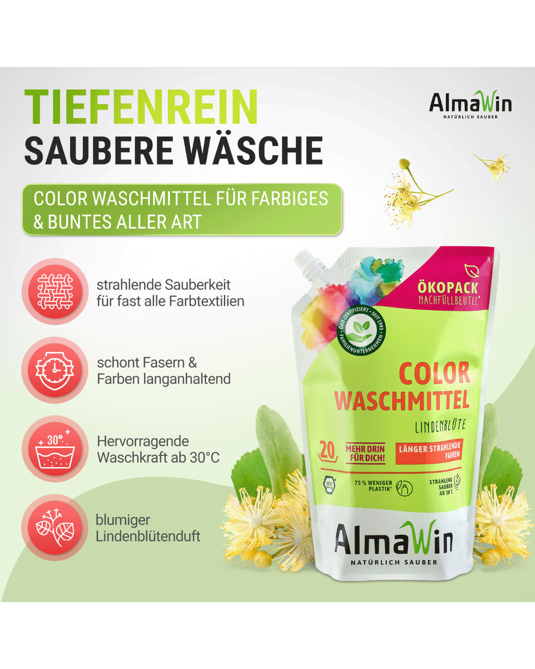Das AlmaWin Color Waschmittel im umweltfreundlichen ÖkoPack bringt deine farbige Wäsche zum Strahlen. Der blumige Lindenblütenduft verleiht der Wäsche eine dezente Frische, während die Farben dank der schonenden Rezeptur ihre Brillanz bewahren. AlmaWin verzichtet dabei komplett auf Enzyme und setzt auf natürliche Inhaltsstoffe, die deine Textilien pflegen und gleichzeitig die Umwelt schonen.