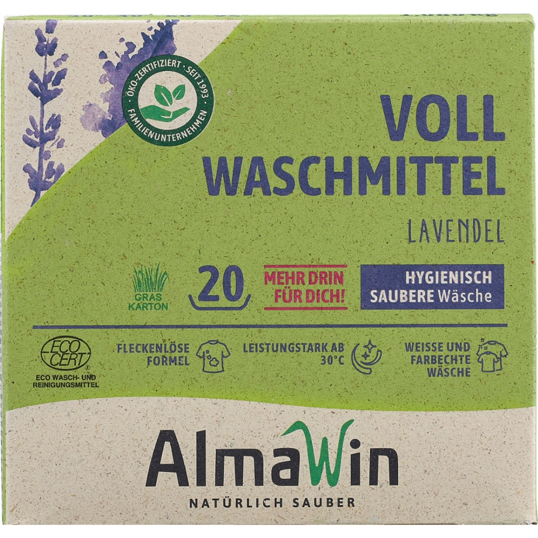 AlmaWin Vollwaschmittel kombiniert starke Reinigungskraft mit natürlichen Inhaltsstoffen und einem angenehmen Lavendelduft. Entwickelt für alle weißen und farbechten Textilien, sorgt es bereits ab 30°C für strahlende Sauberkeit. Der Waschkraftverstärker aus aktivem Sauerstoff entfernt auch hartnäckige Flecken zuverlässig, während gentechnikfreie Enzyme und Reisstärke die Wäsche griffig machen und das Bügeln erleichtern.