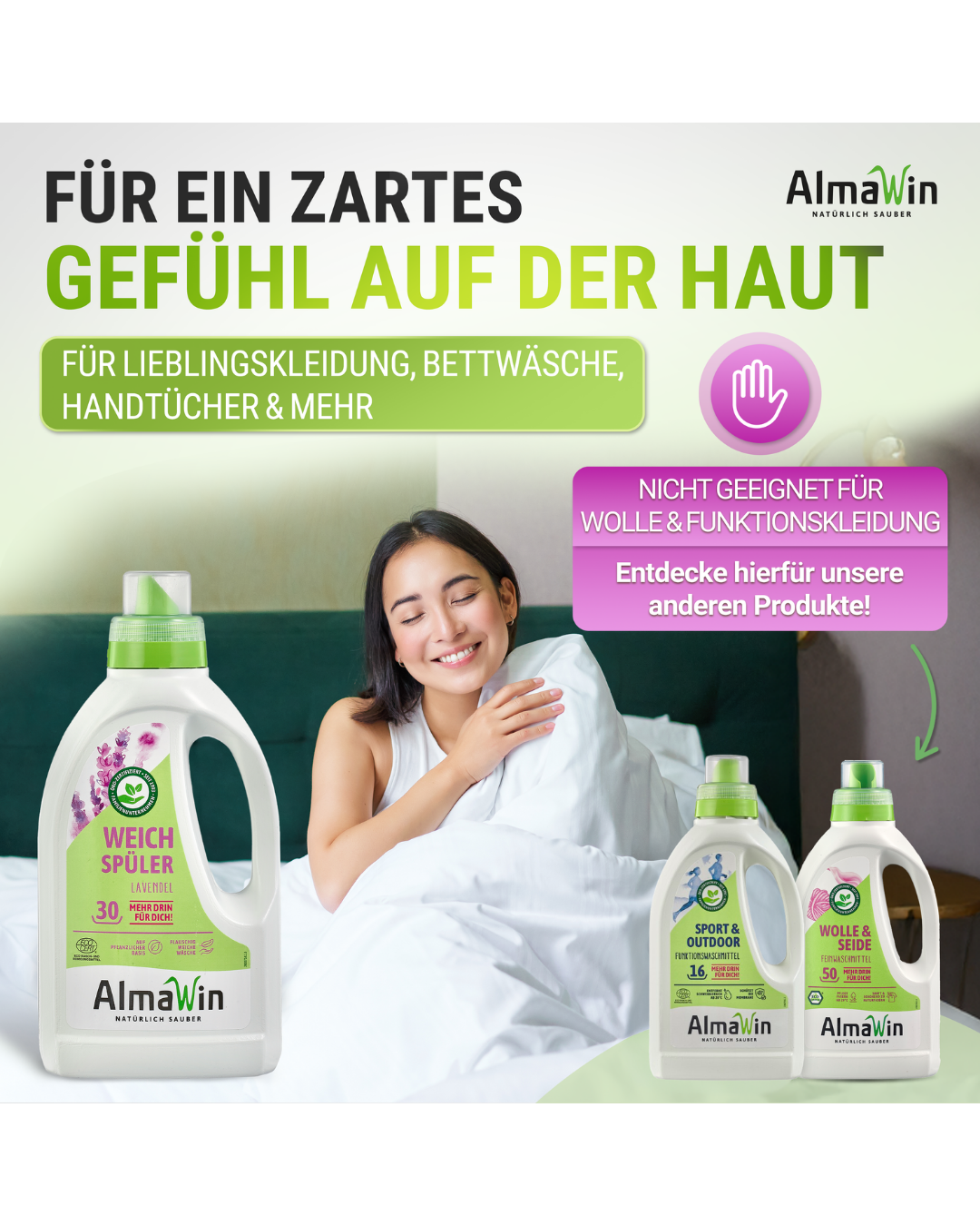 Der AlmaWin Weichspüler verzichtet auf synthetische Duft-, Farb- und Konservierungsstoffe. Stattdessen setzt er auf natürliche Inhaltsstoffe, die pflanzlichen Ursprungs sind. Dies garantiert eine schonende Pflege deiner Textilien bei gleichzeitiger Rücksichtnahme auf die Umwelt.