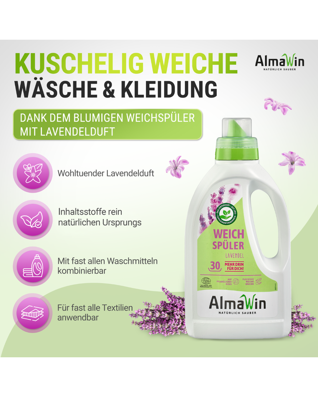 Dank des natürlichen Lavendelöls verleiht der Weichspüler deiner Wäsche nicht nur eine entspannende Note, sondern sorgt auch für ein frisches und langanhaltenden Duft. Das Produkt ist hochkonzentriert und lässt sich mit allen AlmaWin Waschmitteln kombinieren, allerdings nicht für Funktionstextilien geeignet.