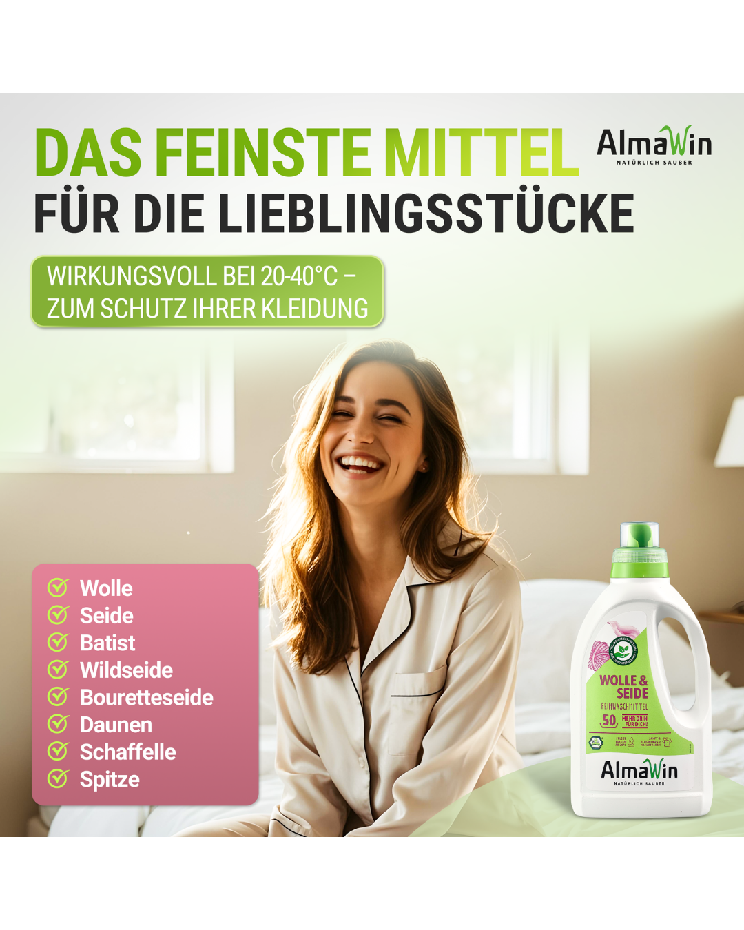 AlmaWin passt perfekt zu unseren Werten, denn unser Unternehmen steht für natürliche Qualität und Umweltbewusstsein. Mit einer biologisch abbaubaren Formel und der konsequenten Verwendung von recycelbaren Materialien überzeugt uns AlmaWin bei greenist. Diese Kombination aus Nachhaltigkeit und hoher Wirksamkeit garantiert dir eine schonende Pflege deiner Textilien, die zugleich die Umwelt respektiert und schützt.