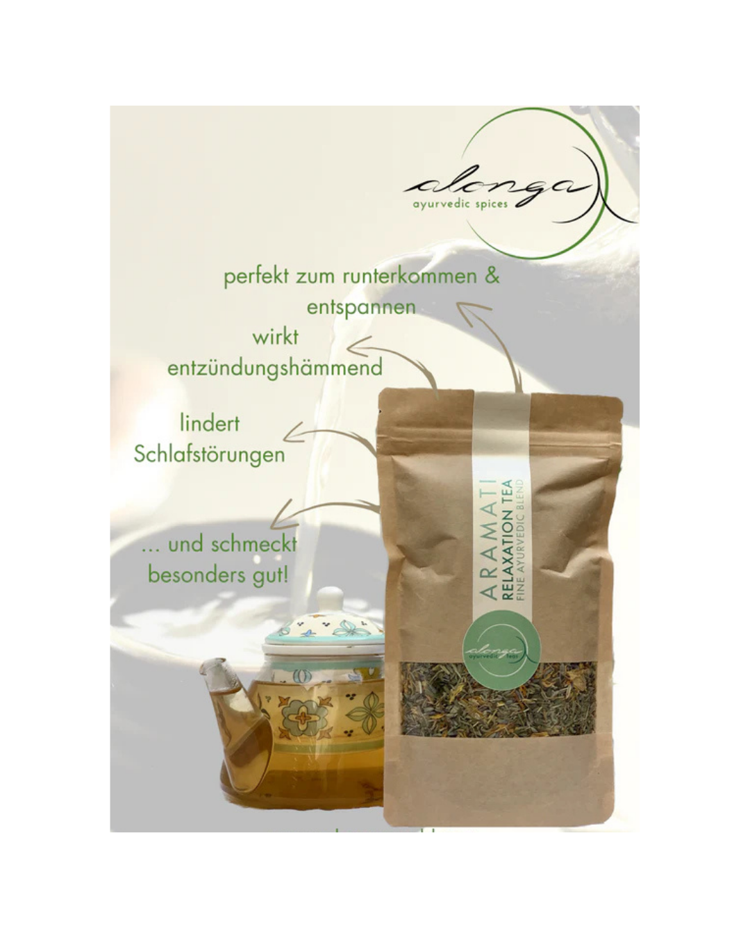 Die Teemischung wird in einer ökologisch zertifizierten Glasmanufaktur in Deutschland von einem kleinen Team in Handarbeit abgefüllt. Aramati verbindet ayurvedisches Wissen mit hochwertigen Bio-Rohstoffen und legt Wert auf natürliche Rezepturen ohne Zuckerzusatz oder künstliche Zusatzstoffe.
