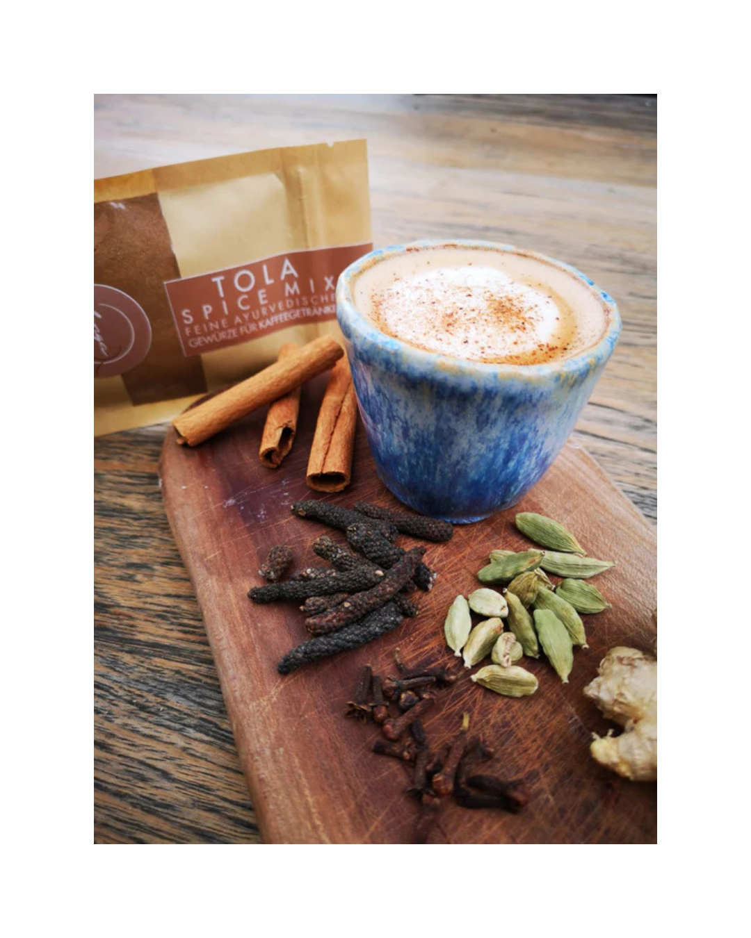 Die Tola Gewürzmischung vereint ausgewählte ayurvedische Gewürze für ein besonders aromatisches Kaffeeerlebnis. Zimt, Kardamom, Nelken, Süßholz und langer Pfeffer verleihen Kaffeespezialitäten, Frühstücksbowls, Schokolade und Gebäck eine warme, exotische Note.