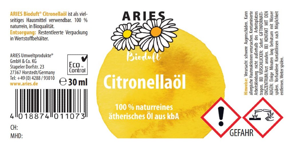 Citronellaöl ist als vielseitiges Hausmittel einsetzbar. Für ausführliche Anwendungshinweise empfehlen wir das hinzuziehen von entsprechender Fachliteratur. Verursacht schwere Augenschäden. Kann allergische Hautreaktionen verursachen. Kontaminierte Arbeitskleidung nicht außerhalb des Arbeitsplatzes tragen. BEI VERSCHLUCKEN: Sofort GIFTINFORMATIONSZENTRUM/Arzt anrufen. BEI KONTAKT MIT DEN AUGEN: Einige Minuten lang behutsam mit Wasser spülen. Vorhandene Kontaktlinsen nach Möglichkeit entfernen. Weiter spülen.