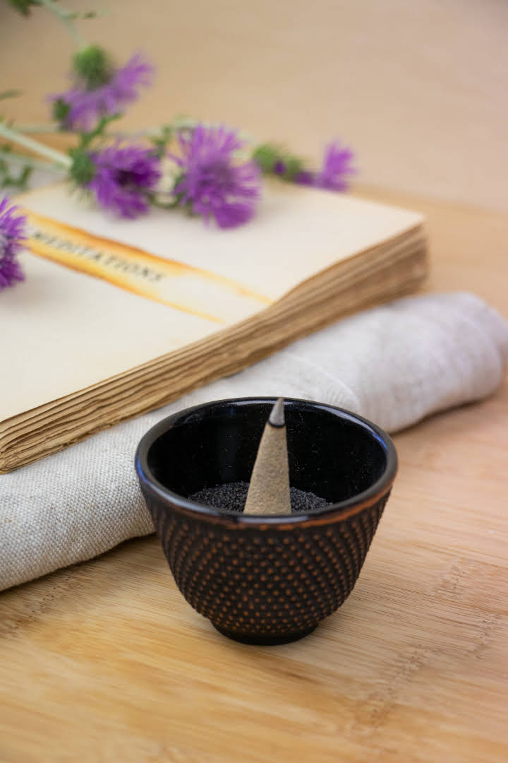 Sand hinzufügen und dann Räucherstäbchen oder -kegel darauf platzieren.
