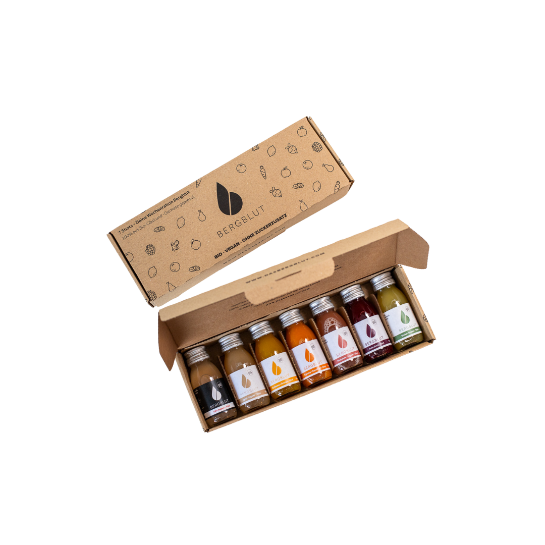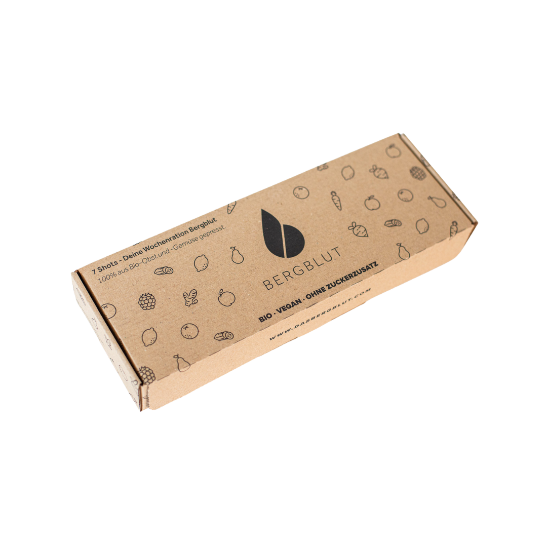 Die Shots werden in einer nachhaltigen Kartonbox geliefert. Die Säfte werden in 100% recycelten PET-Flaschen abgefüllt. Glasflaschen würdem dem Druck, der bei der Abfüllung unter Druck (HPP Verfahren) entsteht, nicht standhalten können. Dafür kann bei den Bergblut Bio Säften gänzlich auf auf Konservierungsstoffe oder Konservierung durch Erhitzen verzichtet werden. Genieße die Bio Bergblut Säfte als Zwischenmahlzeit, als Vitaminkick, während einer anstrengenden Arbeitswoche, oder einfach als Frühstückssaft.