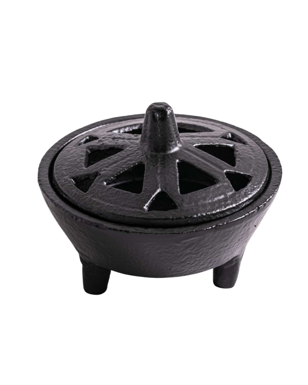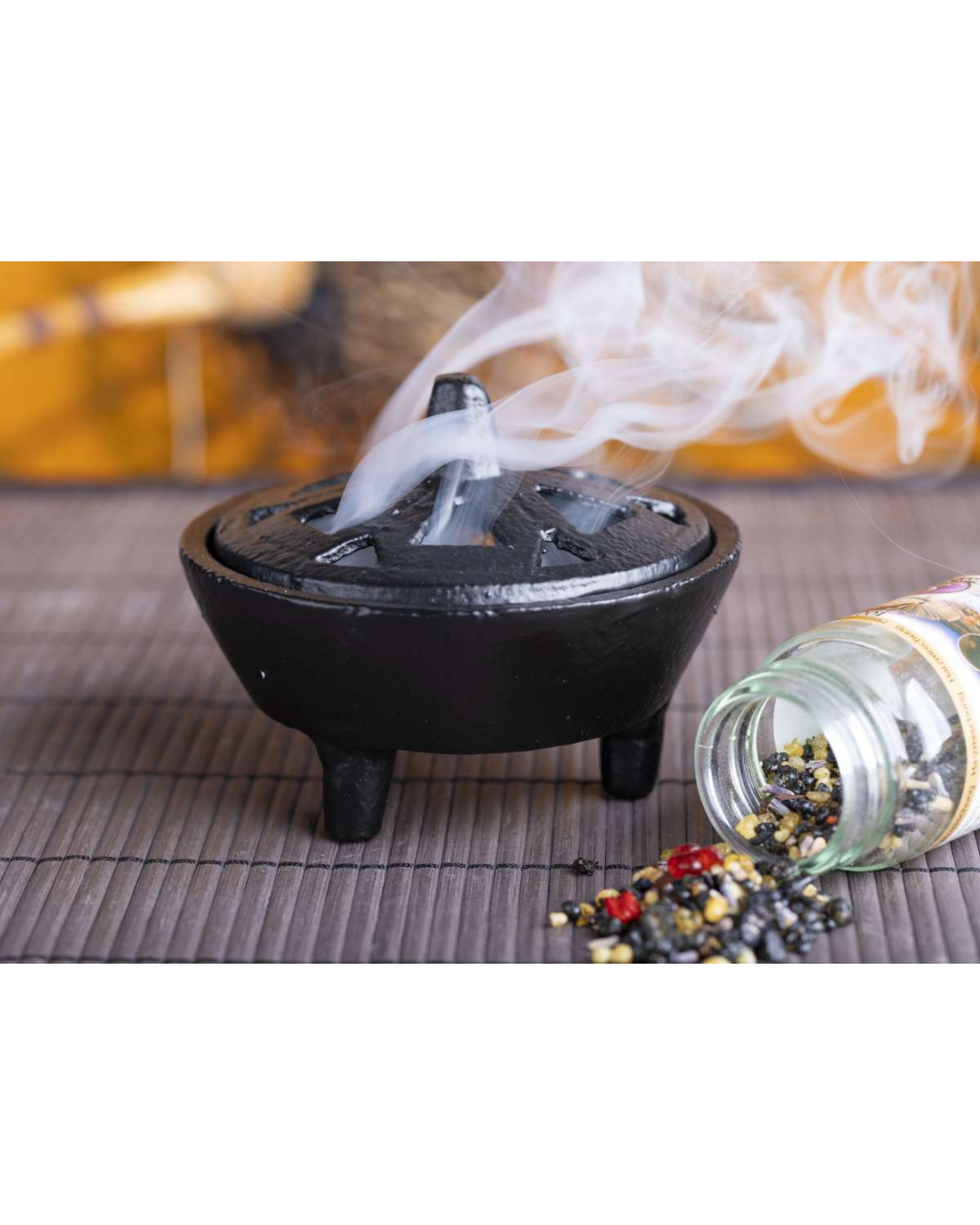 - Schweres Gusseisengefäß Idhril zum sicheren Räuchern. Mit Sand befüllbar; ornamentierter Deckel erzeugt mystische Rauchfahne. H 8 cm, Ø 10,5 cm.