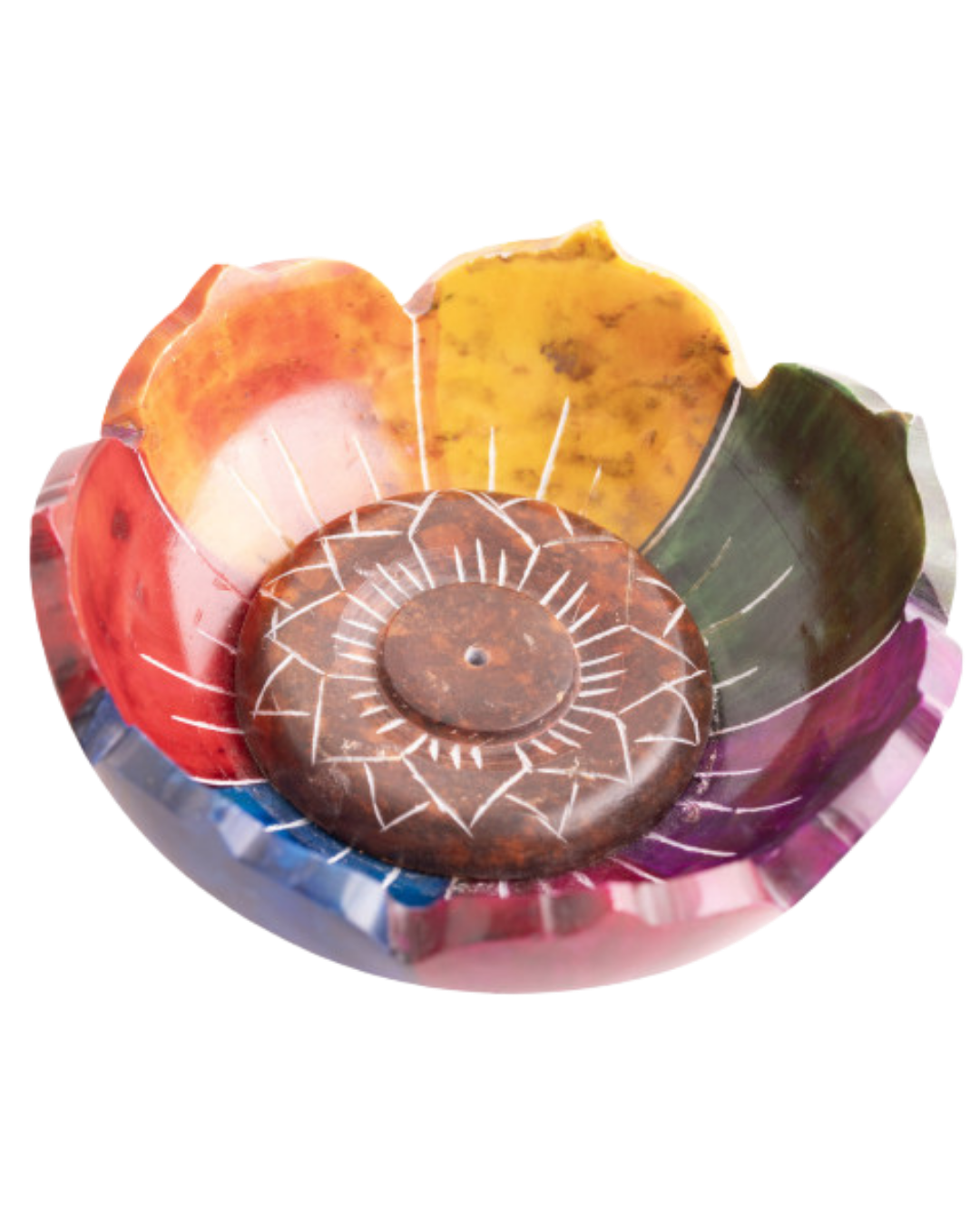 - Lebensfroher Lotus Halter: Lotusschale aus Speckstein mit farbigen Blütenblättern. Ø10 cm Schale fängt zuverlässig Asche auf - ideal für Räucherstäbchen und als dekoratives Wohnaccessoire.