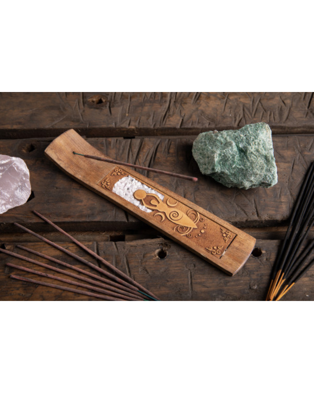 - Mondgöttin Räucherstäbchenhalter aus Akazienholz mit Regenbogenmondstein. Feine Gravuren und echte Mineralien - stärkt die Intuition und setzt edle Akzente beim Räuchern.