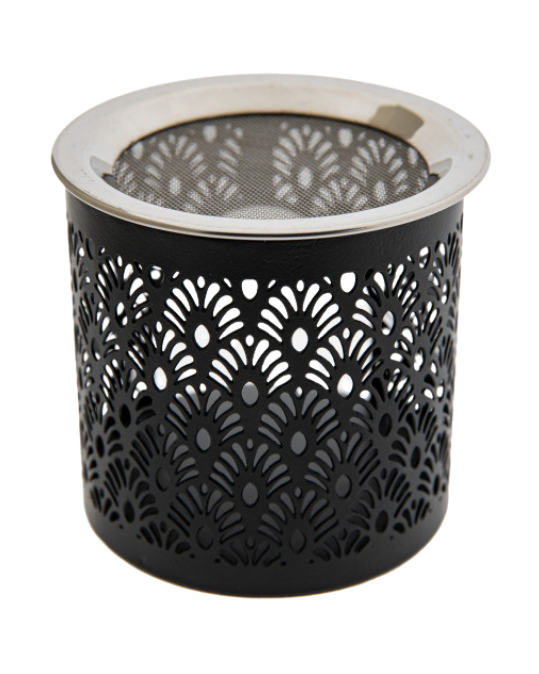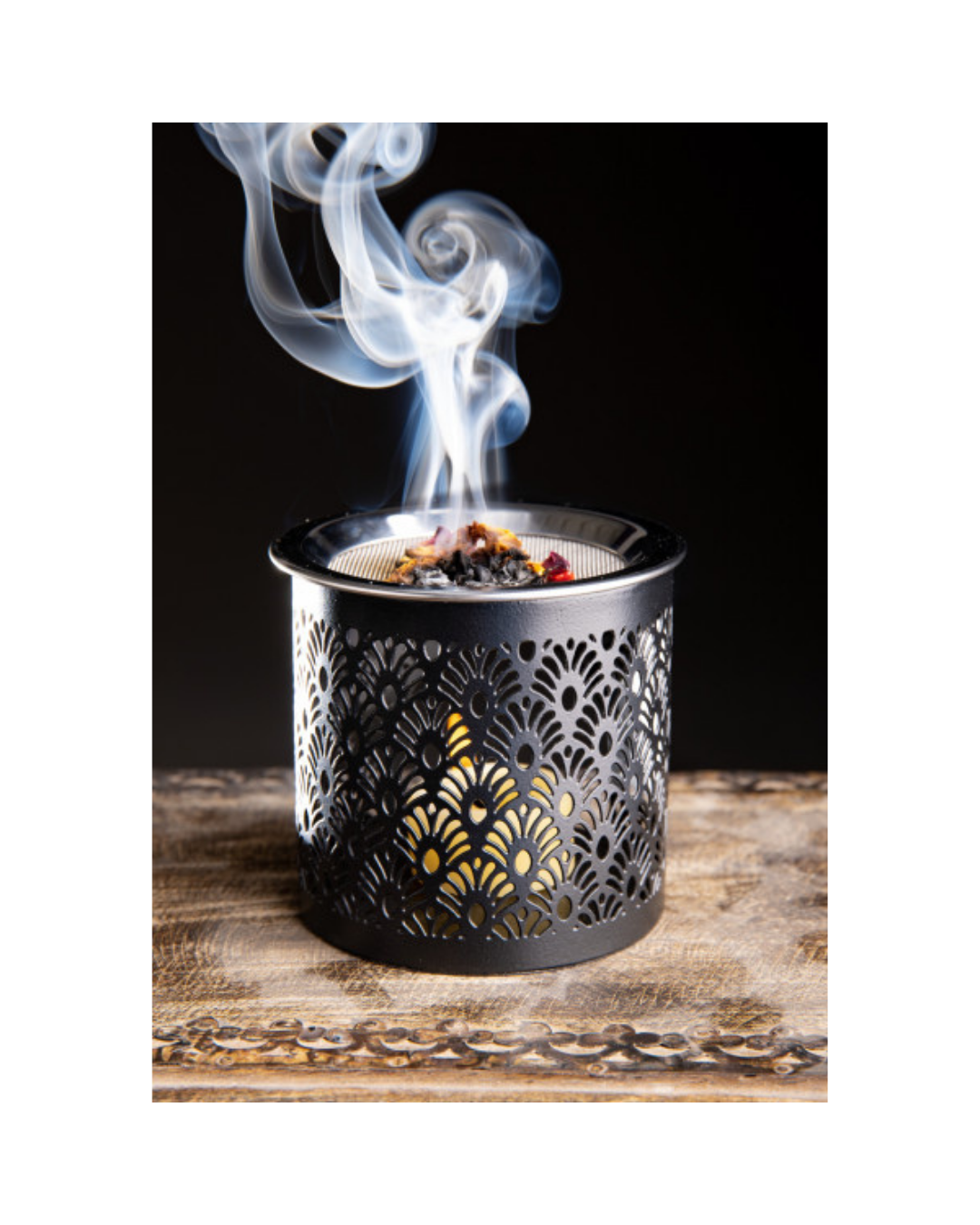 • Siebgefäß Ornament: kleines Räucherstövchen zum Räuchern ohne Kohle. Feinmaschiges Edelstahlsieb auf schwarz gepudertem Eisen. Ideal für Harze, Kräuter und Hölzer. H 8 cm, Ø 8 cm.