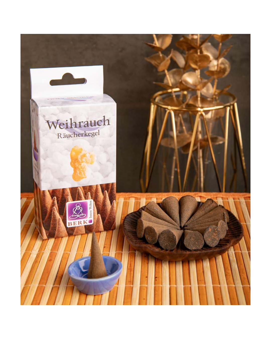 - Räucherkegel Weihrauch (Masala) - 14 handgefertigte Kegel (20 g) mit Keramikhalter. Reinigt Raumenergie, beruhigt Geist und schafft klare, ruhige Atmosphäre.