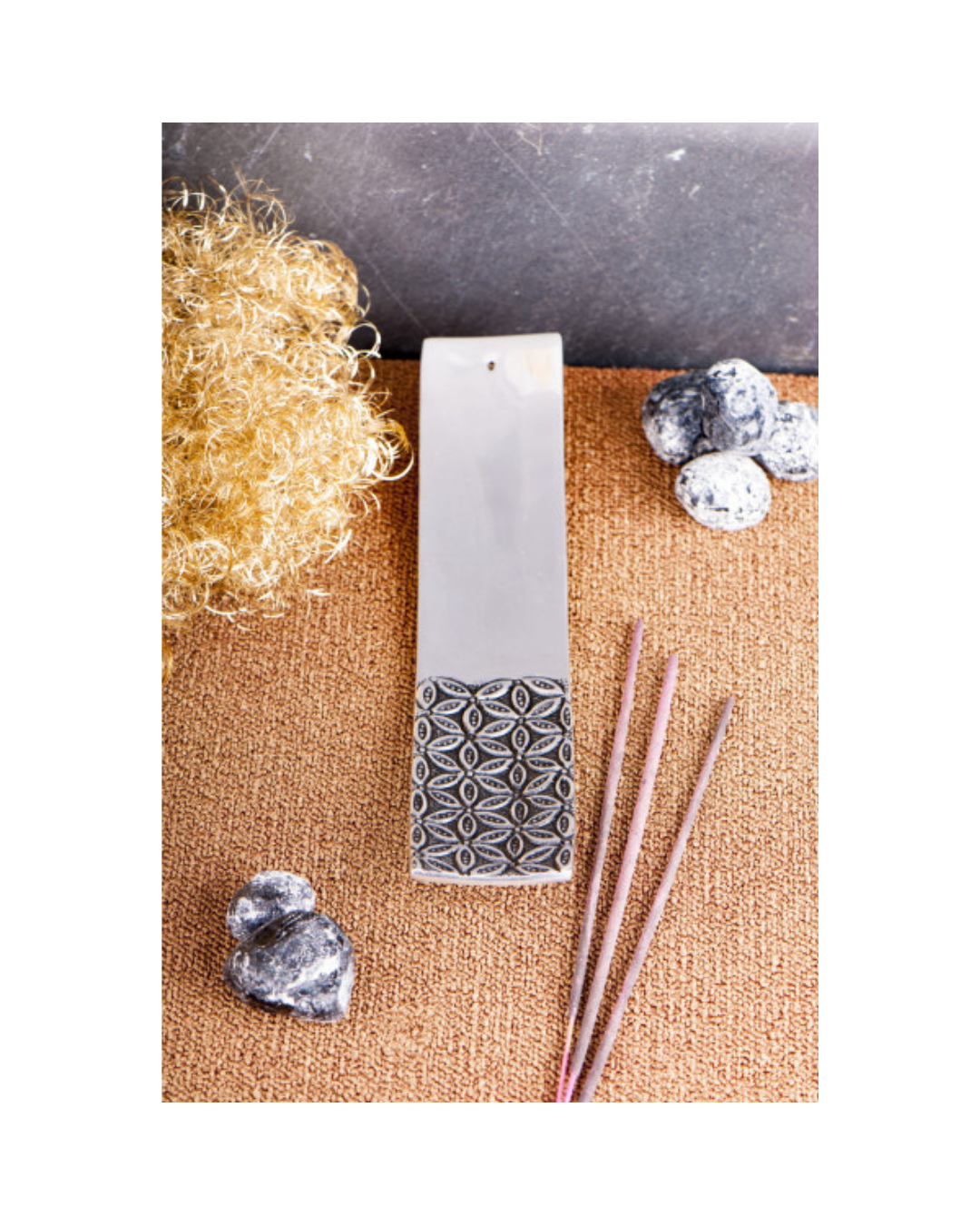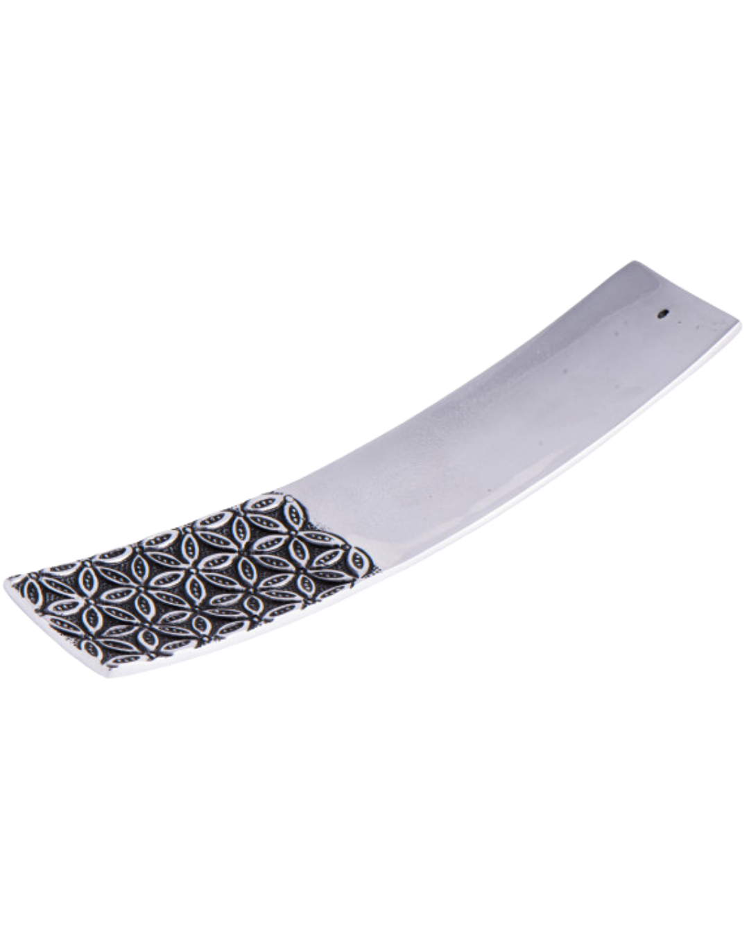 - Moderner Räucherstäbchenhalter aus Weißmetall mit tiefem Blume?des?Lebens-Relief. Extra breit (24 x 4,8 cm) und leicht gebogen - verhindert Aschefall und wirkt elegant.
