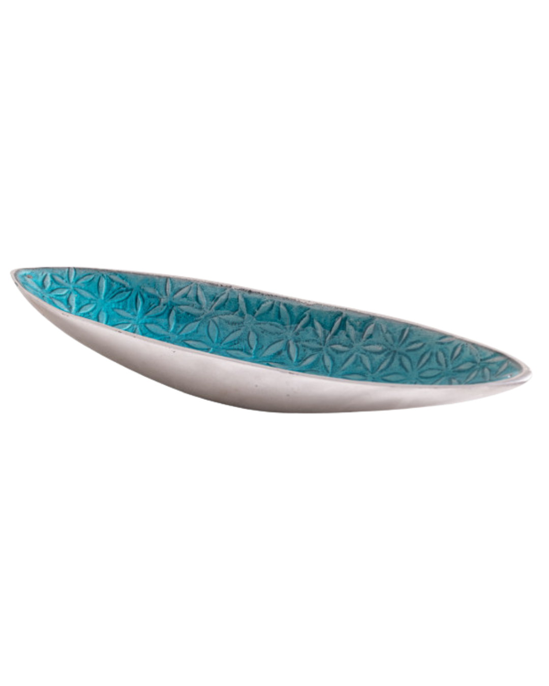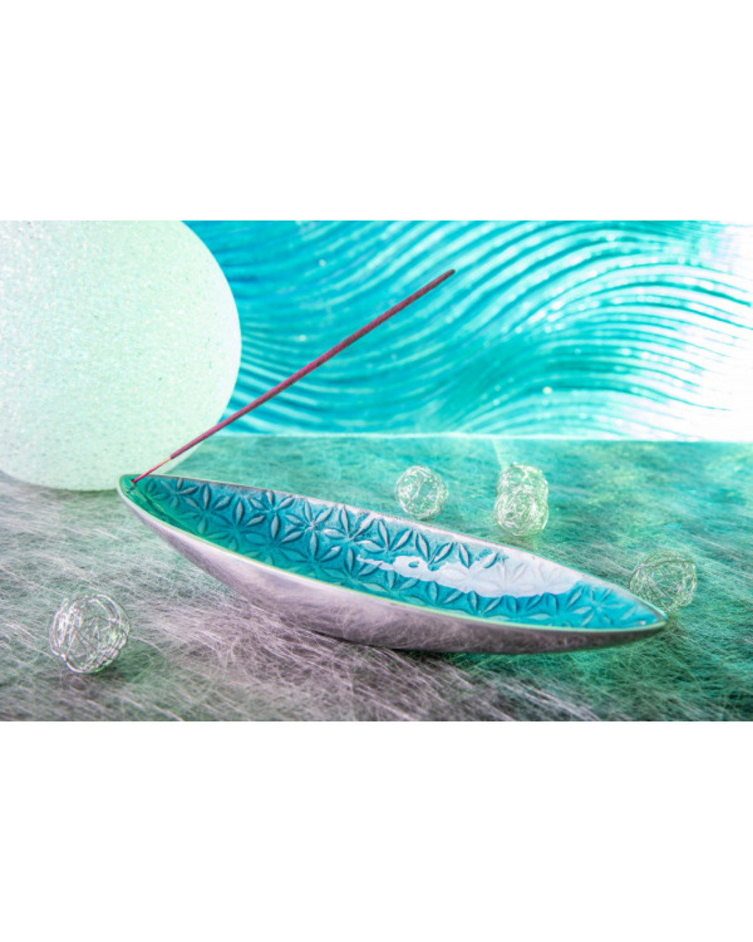 - Schmaler Schiffchenhalter mit türkisfarbener Glasur und Blume-des-Lebens-Relief. Maße 27×8 cm - dekoratives Räucherzubehör im mystischen Ägypten-Stil.
