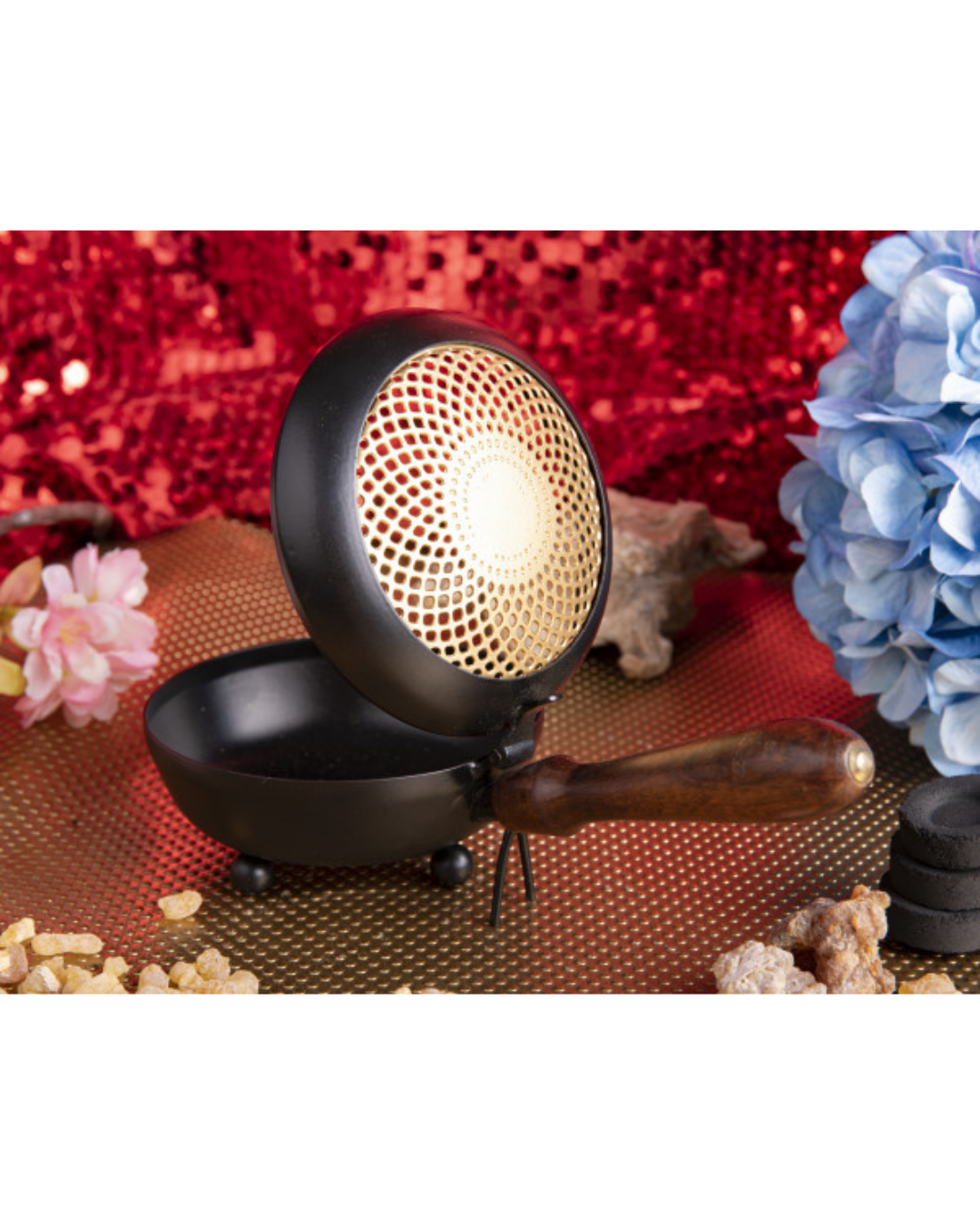 - Tragegefäß 'Sonne' - handliches Räuchergefäß aus Eisen mit goldfarbenem Deckel und langem Holzgriff. Perfekt für Raum- und Aurareinigungen sowie Aurareinigung.