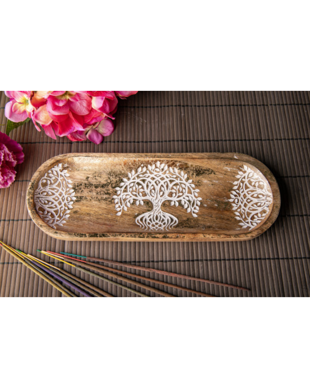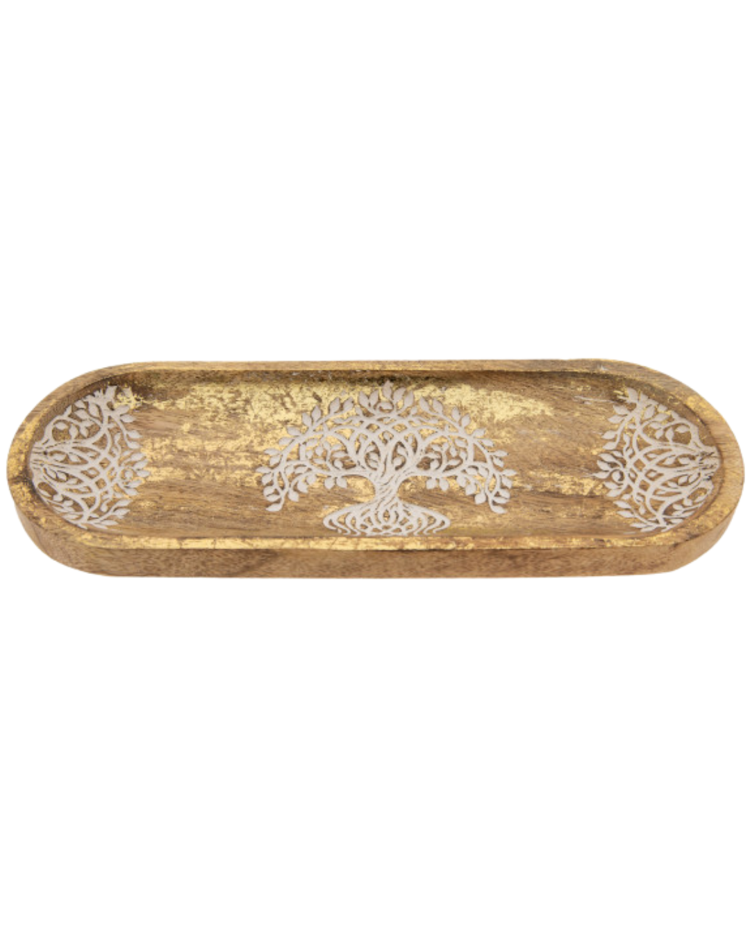 - Yggdrasil Räucherstäbchenhalter aus massivem Mangoholz (27,5 x 10 cm) mit Blattgoldverzierung und lasergraviertem, weiß eingewachstem Symbol - robuster Hingucker.
