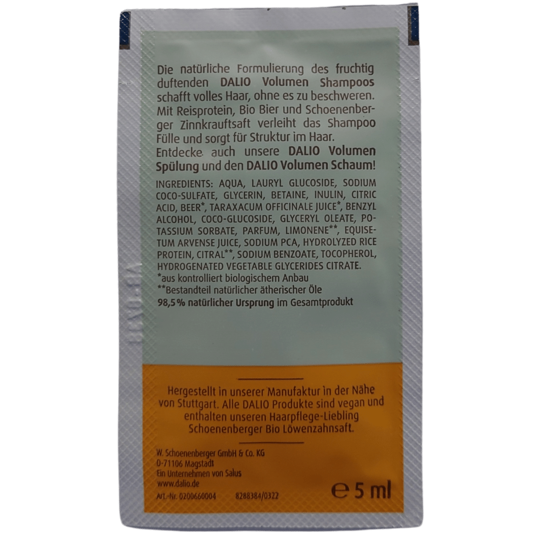 Das Dalio Volumen Shampoo ist die ideale Lösung für feines und kraftloses Haar. Diese sorgfältig entwickelte Formel verleiht deinem Haar Fülle und Lebendigkeit. Dalio, ein Hersteller, der für seine hochwertigen Naturkosmetikprodukte bekannt ist, verwendet ausschließlich natürliche Inhaltsstoffe, um sicherzustellen, dass dein Haar gesund und gepflegt bleibt. Bei greenist legen wir großen Wert auf die Auswahl von Produkten, die höchsten Qualitätsstandards entsprechen.