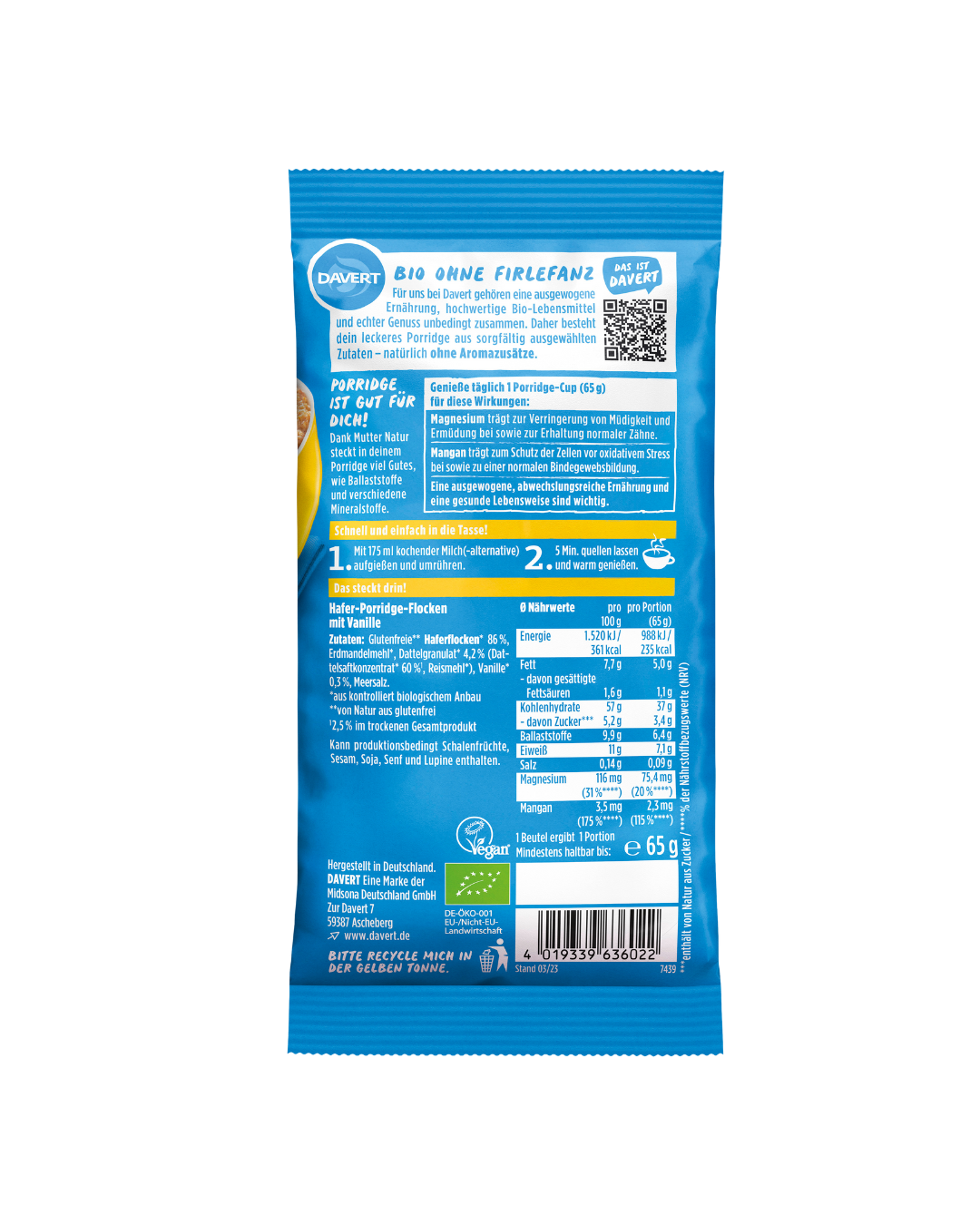 Davert Bio Porridge-Cup Vanille Glutenfrei 65g Produktdetails