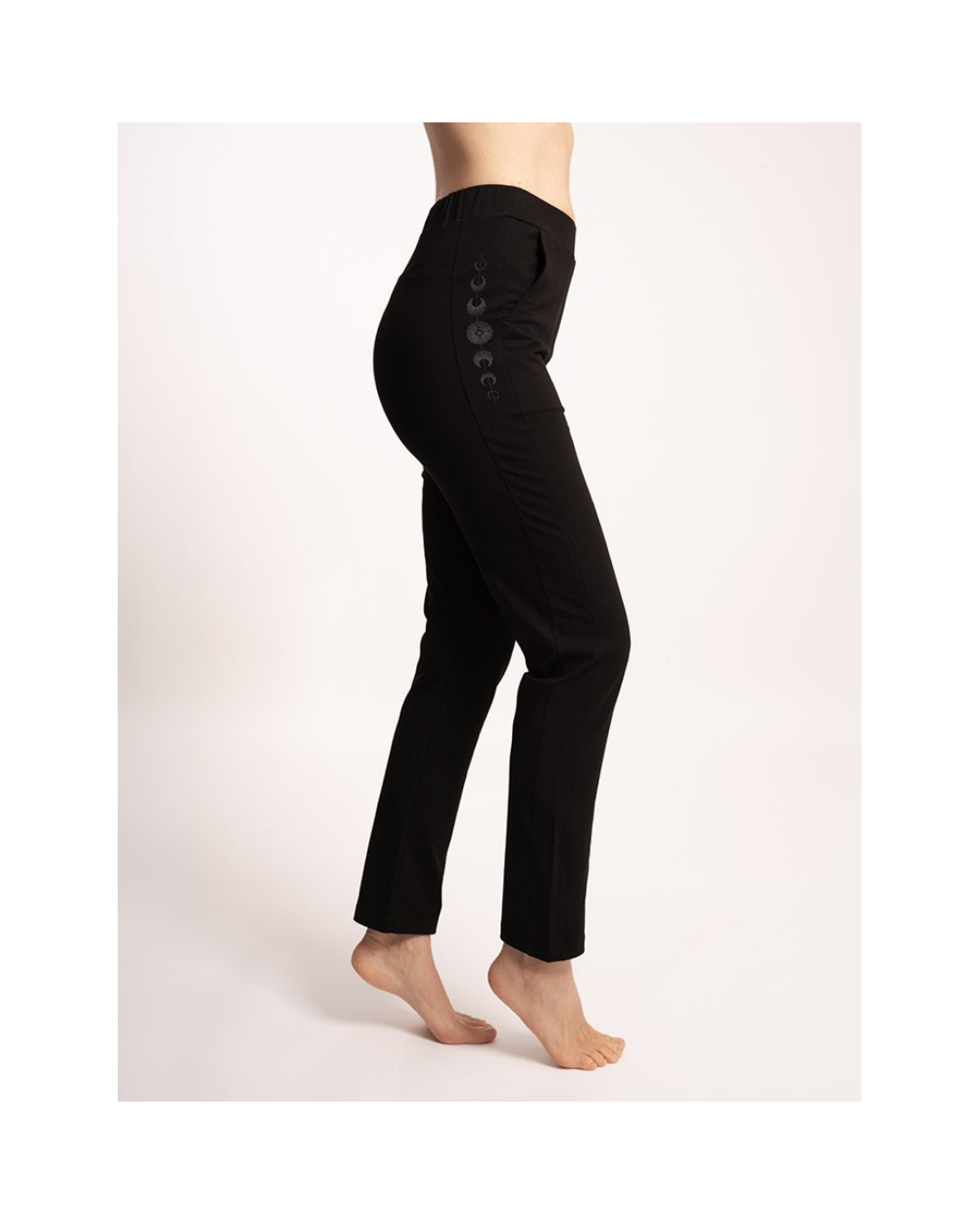 Die hochwertige Bio-Baumwolle fühlt sich weich an und trägt sich auch über viele Stunden angenehm. Ein stilisierter Mondphasen-Print an den Hüften setzt einen dezenten Akzent und verleiht dem Design eine besondere Note. Im Stoff verarbeiteter Rosenquarz rundet die charaktervolle Gestaltung ab.