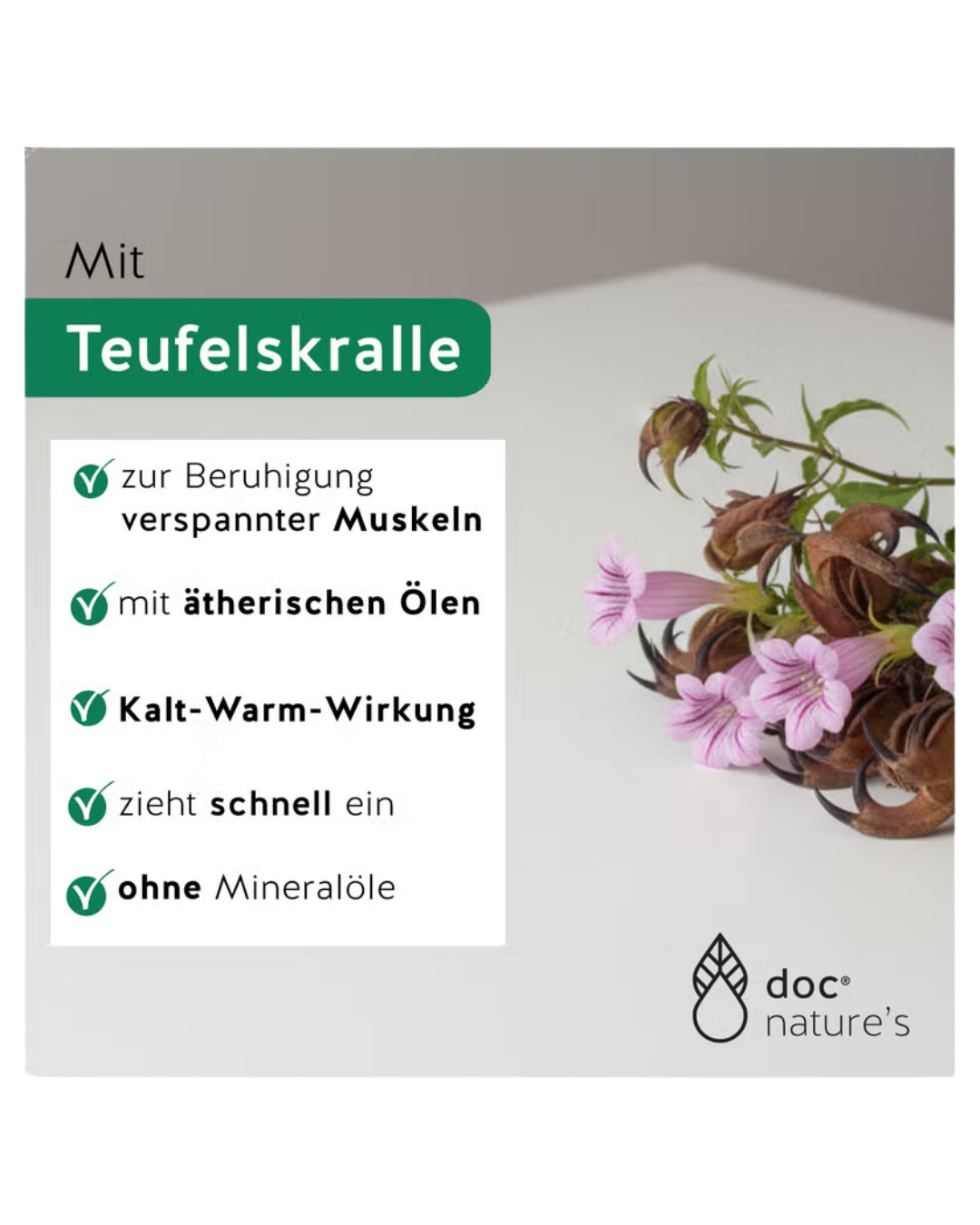doc nature's Teufelskralle Anti-Schmerz Gel: + Schnelle Linderung von akuten Muskel-, Gelenk-, posttraumatischen Schmerzen + mit Teufelskralle & ätherischen Ölen + warm-kalt Effekt + zieht schnell ein + ohne Mineralöle doc nature's Teufelskralle Anti-Schmerz Gel lindert und beruhigt Muskel-, Gelenk- und posttraumatische Schmerzen aufgrund seiner kombinierten warm-kalt Wirkung, wobei das Wärmegefühl je nach Anwender variiert. Die enthaltenen ätherischen Öle tragen durch ihre natürlichen Eigenschaften zur Wirksamkeit bei. Reduziert auch Ödeme (Schwellungen), die bei Kontrakturen, Belastungen, Verstauchungen, Prellungen, Muskelüberspannungen oder anderen Traumen auftreten können. Warnungen: Lesen Sie vor Gebrauch die Packungsbeilage sorgfältig durch, die zusammen mit dem Produkt aufbewahrt werden muss. Über Wirkung und mögliche unerwünschte Wirkungen dieses Medizinproduktes informieren Gebrauchsinformation, Arzt oder Apotheker.