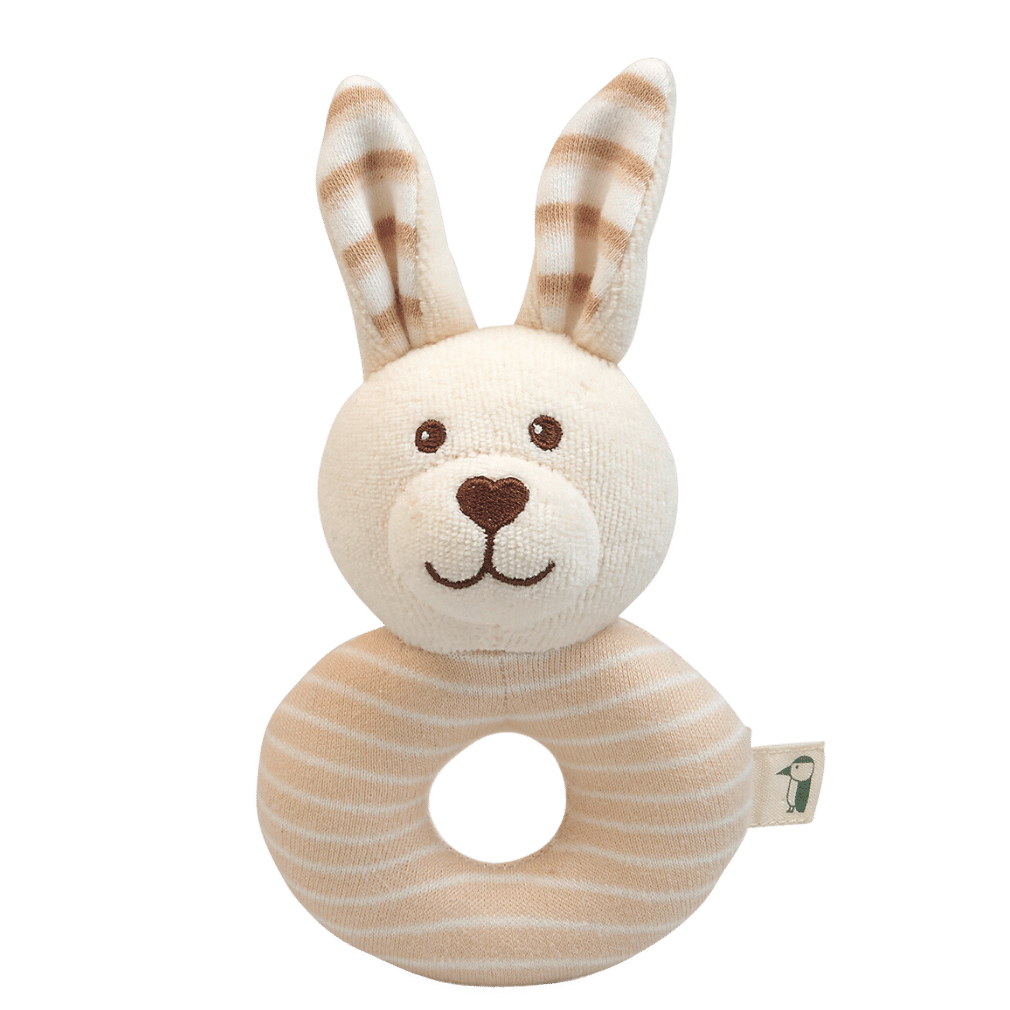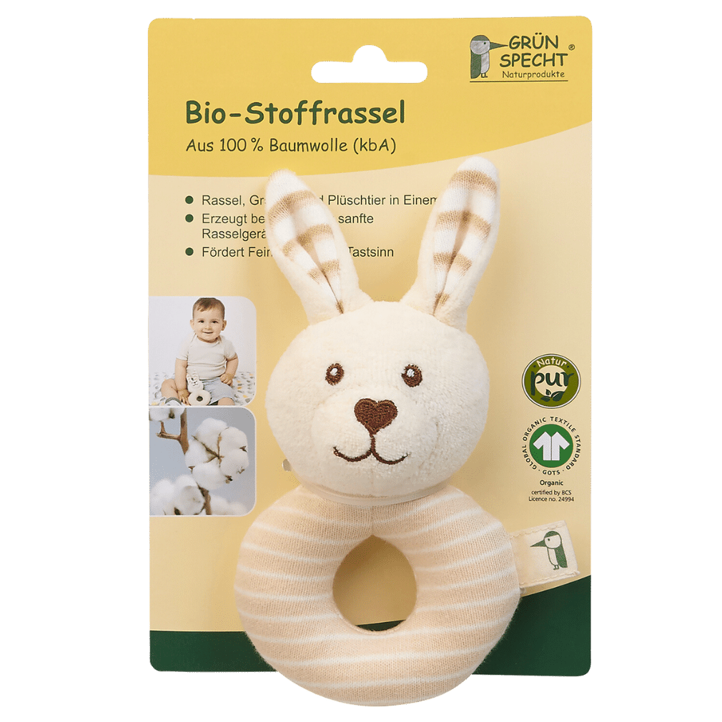 Unsere wunderbar weiche und plüschige Rassel in Hasenform ist ein optimaler Begleiter für Babys von Geburt an. Beim Bewegen erklingt ein Rasselgeräusch. Der kuschelige Greifling aus Plüsch eignet sich hervorragend zum Schmusen und Kuscheln. Unsere Stoffrassel ist GOTS-zertifiziert und aus Baumwolle aus kontrolliert biologischem Anbau hergestellt. Mit dieser Rassel kann das Baby auf spielerische Weise seine ersten Erfahrungen mit Bewegung, Tasten sowie Hören und Greifen machen. Babys nehmen Dinge gern in den Mund, um sie näher kennenzulernen. Das können sie mit dieser Babyrassel ohne weiteres tun. Die Bio-Baumwolle (kbA) wird entsprechend den strengen Bedingungen des GOTS-Standards angebaut und das Produkt wird entsprechend geprüft. Die Rassel ist außerdem ein wunderschönes Geschenk zur Geburt.