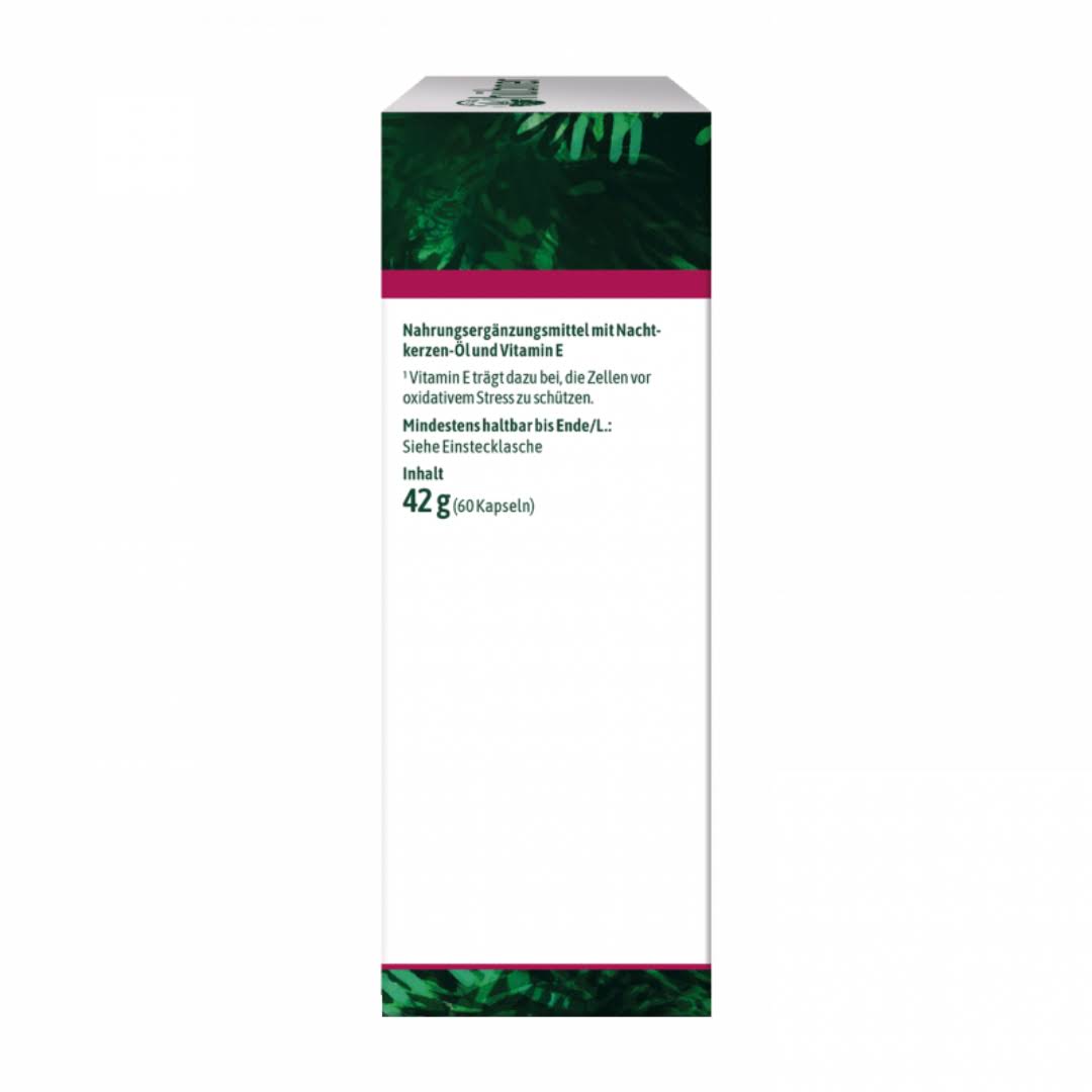 Die Nachtkerzen-Öl Kapseln enthalten reines, kaltgepresstes Samen-Öl der Nachtkerze (Oenothera biennis). Dieses Öl ist besonders wertvoll wegen seiner essentiellen, mehrfach ungesättigten Omega-6-Fettsäuren, wie Linolsäure und Gamma-Linolensäure, die wichtige Funktionen im Körper erfüllen und zur Hautgesundheit beitragen.
