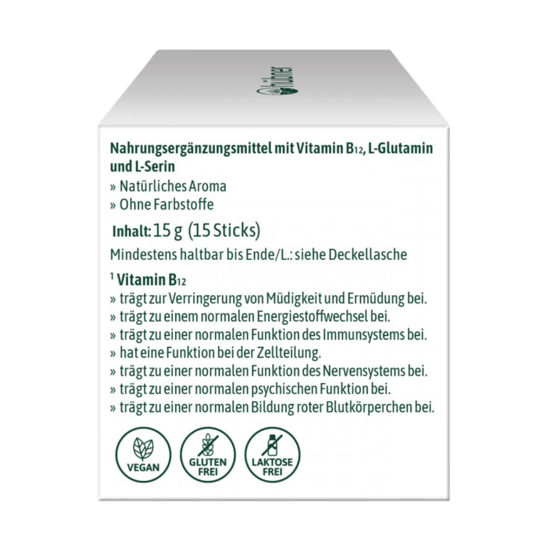 Unsere Vitamin B12 Direktsticks bieten eine hochwertige Kombination aus Vitamin B12 und den ausgewählten Eiweißbausteinen L-Glutamin und L-Serin. Diese beiden Aminosäuren unterstützen die Funktion von Vitamin B12 optimal und tragen dazu bei, dass dein Körper das Vitamin bestmöglich verwerten kann. Der natürliche Waldfrucht-Geschmack rundet die Sticks ab und sorgt für ein angenehmes Geschmackserlebnis.