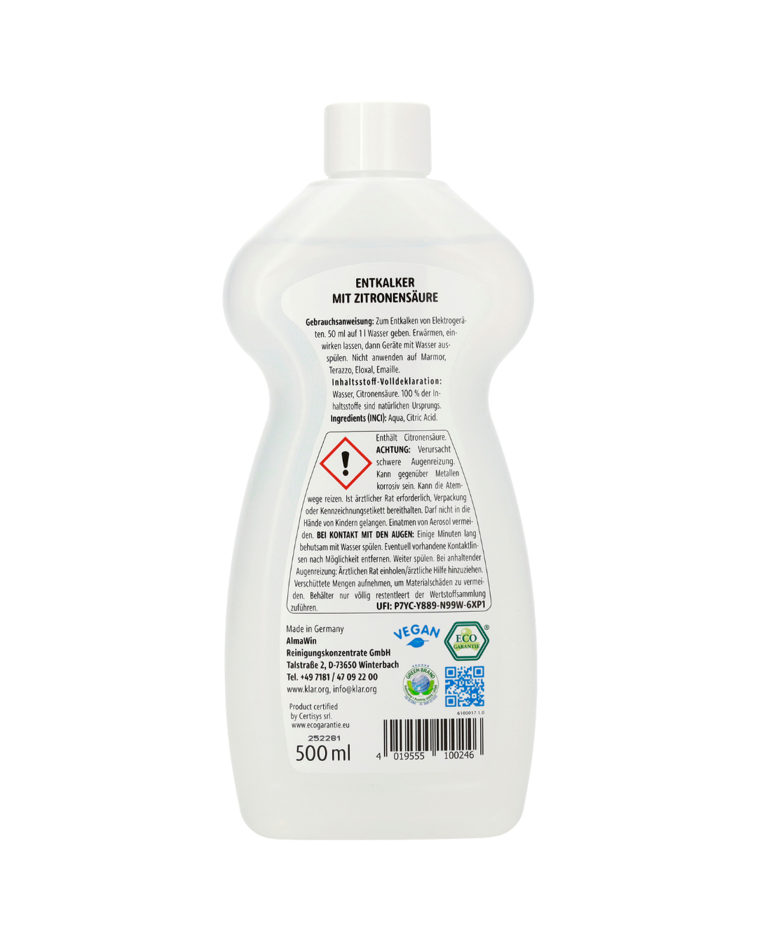 Klar Entkalker mit Zitronensäure zum Entkalken von Elektrogeräten. Kraftvoll und ergiebig ohne Duft.