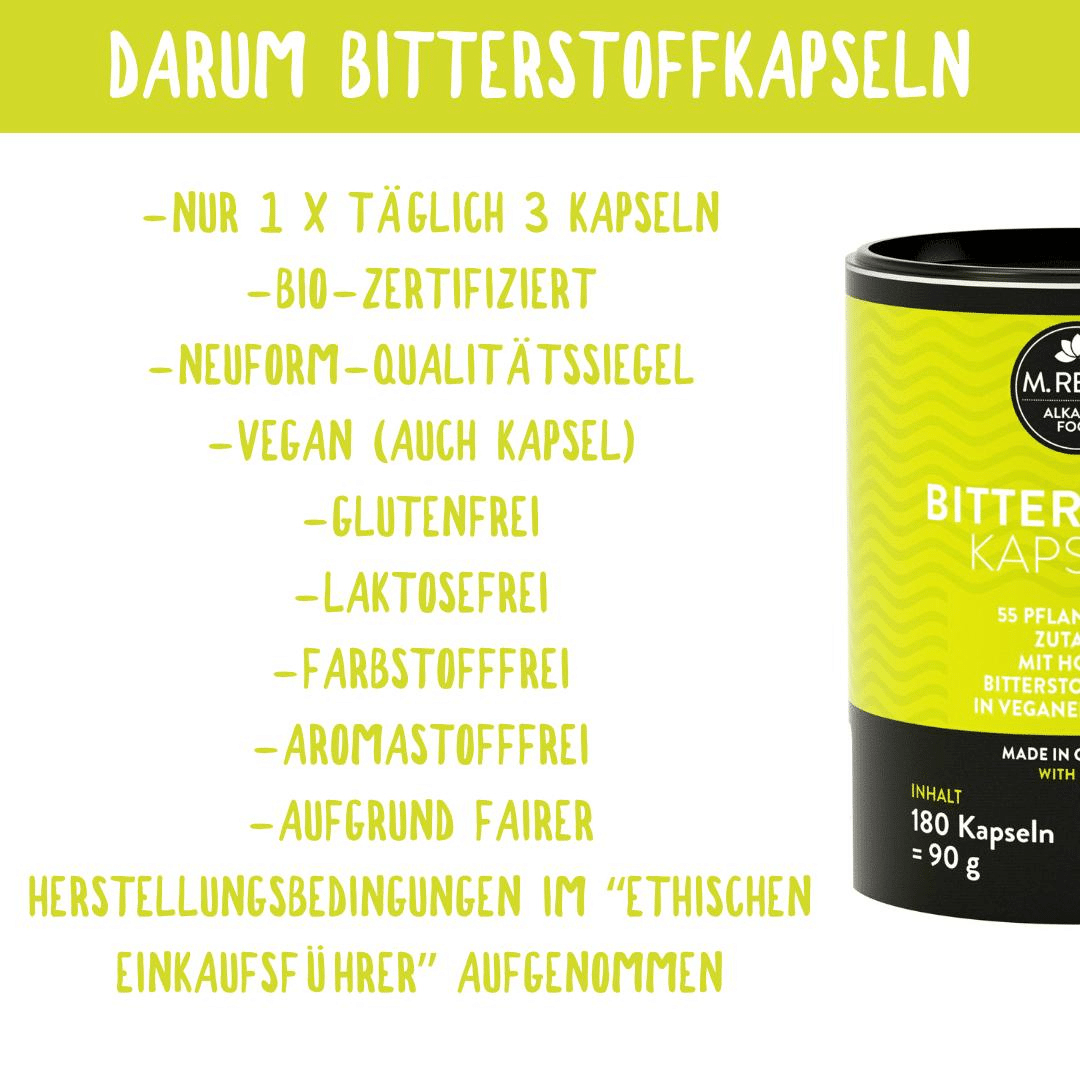 Möchtest du die Vorteile von Bitterstoffen genießen, ohne den bitteren Geschmack auf der Zunge zu spüren? Dann sind die M. Reich BitterStoffKapseln genau das, was du suchst. Entwickelt für Menschen, die die positiven Eigenschaften von Bitterstoffen nutzen möchten, ohne dabei den Geschmack in Kauf nehmen zu müssen. Die innovative Formel ermöglicht es, dass die Bitterstoffe dort wirken, wo sie gebraucht werden - direkt im Magen-Darm-Trakt.