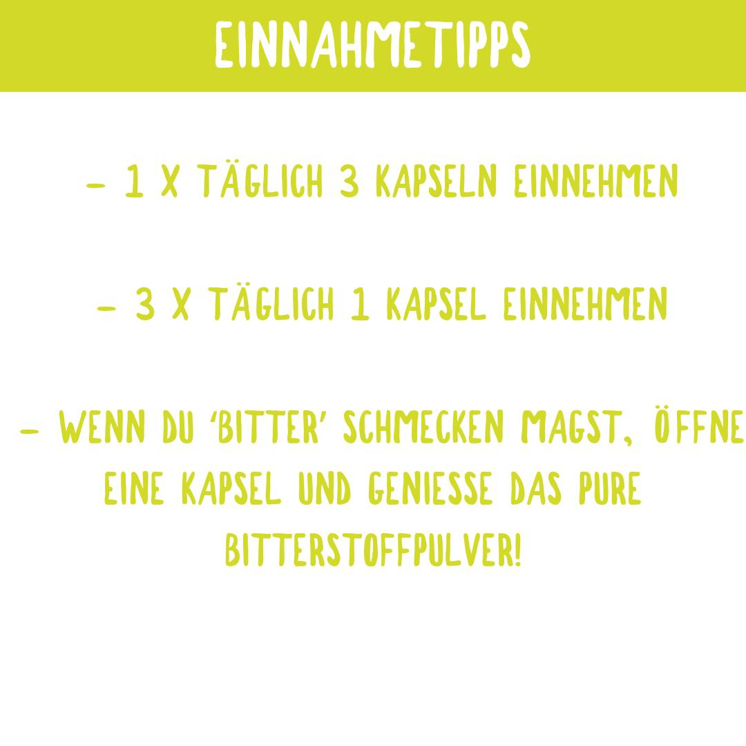 Die BitterStoffKapseln zeichnen sich durch ihre einfache Handhabung aus. Mit stillem Wasser eingenommen, löst sich die vegane Kapselhülle im Magen-Darm-Trakt auf und entfaltet dort ihre Wirkung. Da wir komplett auf Füll- oder Hilfsstoffe verzichten, sind die Kapseln besonders gut verträglich. Diese einfache Anwendung macht sie zu einem idealen Begleiter für deinen Alltag.