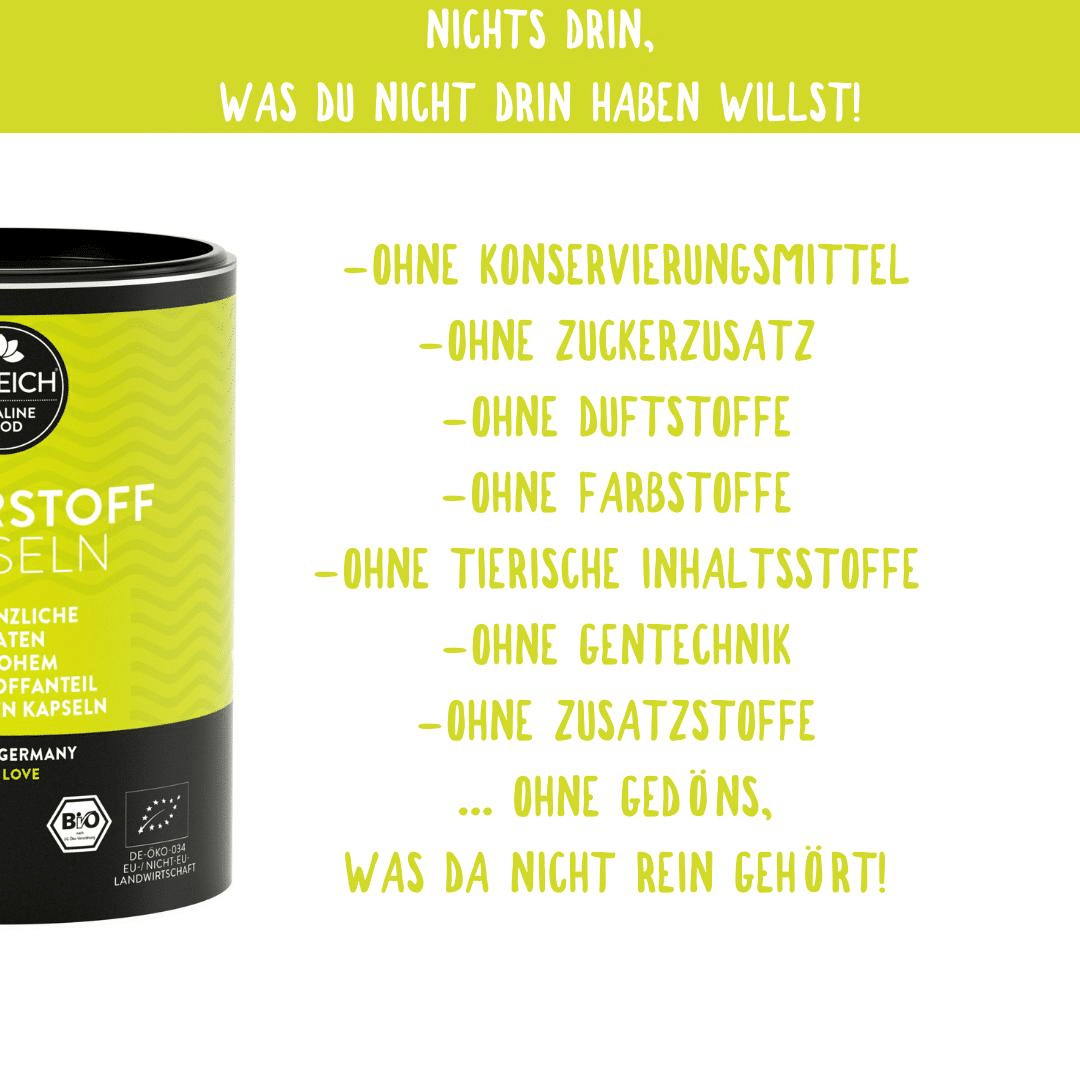 Die Reinheit unserer Produkte ist uns besonders wichtig. Die BitterStoffKapseln sind frei von Soja, Gluten, Laktose sowie jeglichen Hilfs-, Aroma-, Farb- und Konservierungsstoffen. Als vegan zertifiziertes Produkt steht es im Einklang mit unserem Streben nach einem natürlichen und bewussten Lebensstil. Zudem sind sie, wie alle Produkte von M. Reich, mit Liebe in Deutschland hergestellt.
