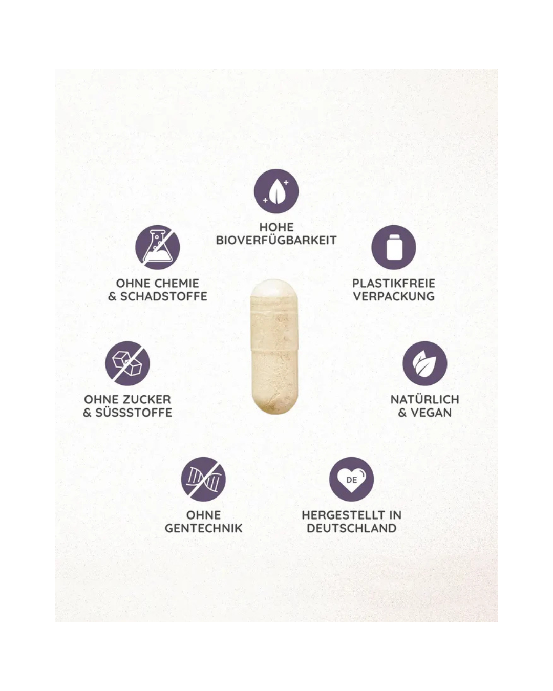 • Hohe Bioverfügbarkeit: Uns liegen natürliche Zutaten sehr am Herzen, damit dein Körper unsere Kapseln gut aufnehmen kann.