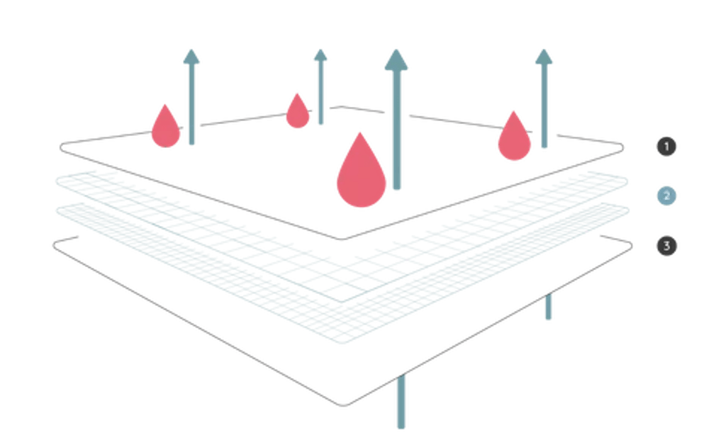 Mittig befindet sich eine Kombination verschiedener Gewebeschichten auf der Basis von Polyester. Das Material ist hydrophil, antibakteriell sowie atmungsaktiv und fängt Menstruationsblut und andere Flüssigkeiten sicher auf. Es sorgt dafür, dass nichts durchgeht oder daneben läuft.
