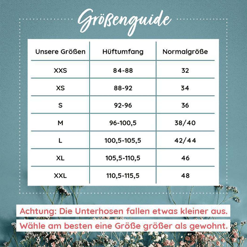 Bestelle die Periodenunterwäsche am besten eine Nummer größer, da die Unterwäsche etwas kleiner ausfällt.