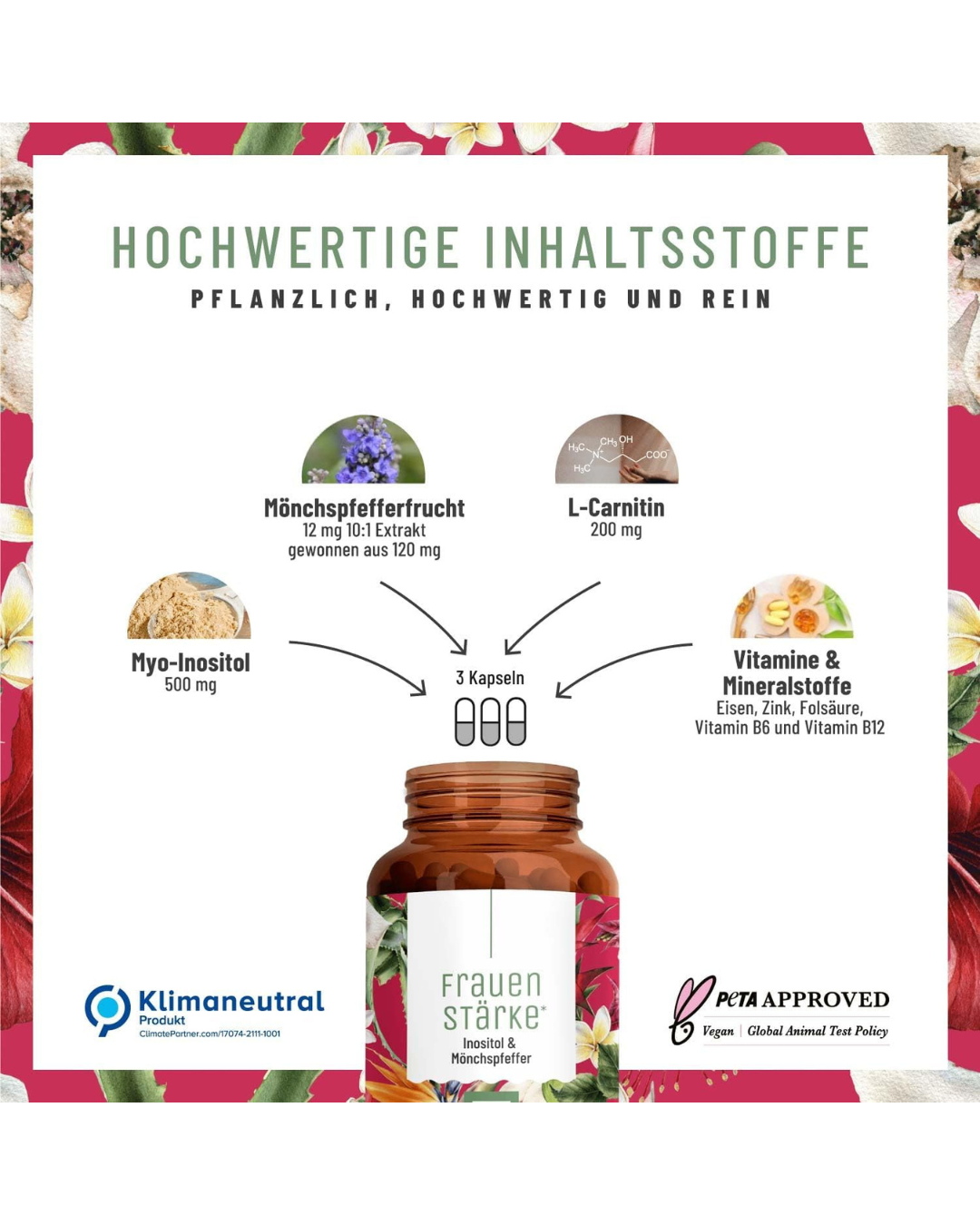 38,5 % Myo-Inositol, Reismehl, Überzugsmittel: Hydroxypropylmethylcellulose (pflanzliche Kapselhülle), Acetyl-L-Carnitinhydrochlorid, Eisensulfat, Zinkbisglycinat, 0,9 % Mönchspfefferfrucht-Extrakt 10:1 (Vitex agnus castus), Pyridoxinhydrochlorid, Calcium-L-Methylfolat, Methylcobalamin.