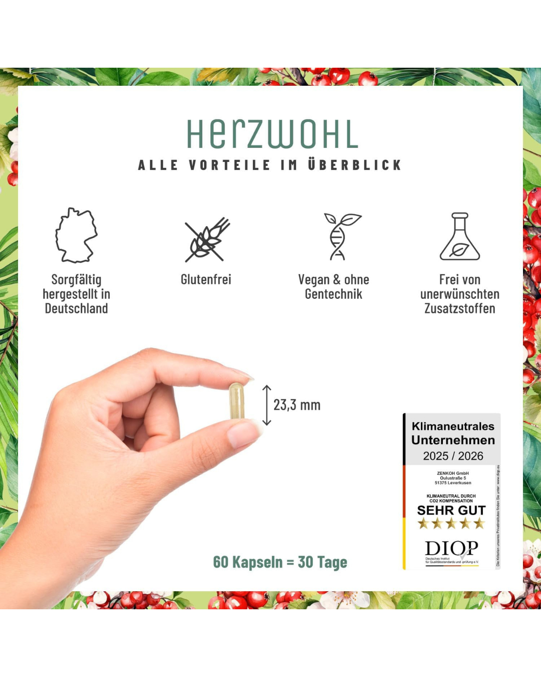 Herzwohl Weißdorn mit Arjuna, Kakao, Q10 und Vitamin B1, 60 Kapseln