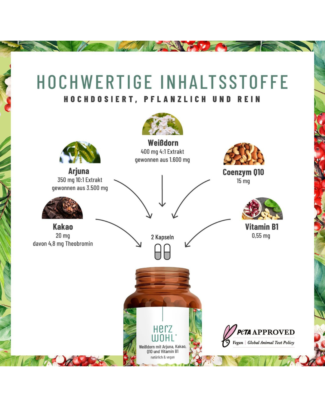 Herzwohl liefert ganze 400 mg 4:1 Weißdorn-Extrakt, gewonnen aus 1.600 mg, 350 mg 10:1 Arjuna-Extrakt und 20 mg Kakao-Extrakt mit 4,8 mg Theobromin.