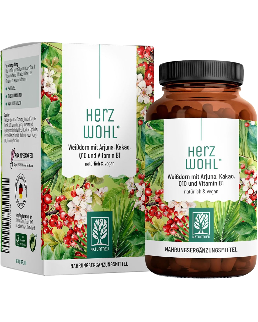 Naturtreu Herzwohl Weißdorn mit Arjuna, Kakao, Q10 und Vitamin B1, 60 Kapseln