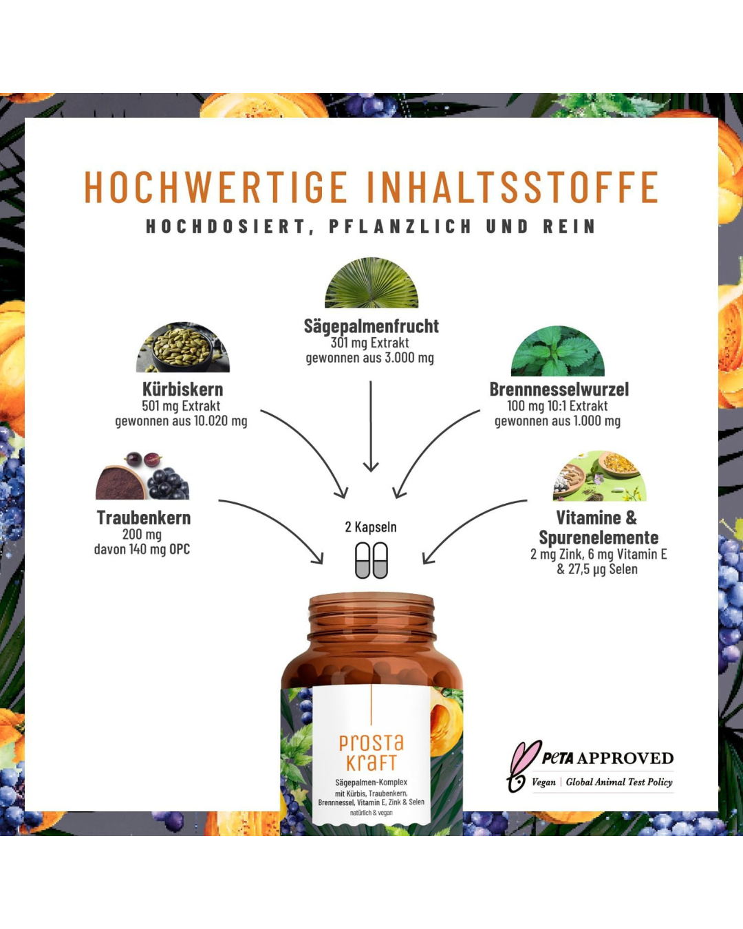 Kürbiskern-Extrakt (Cucurbita pepo), Sägepalmenfrucht-Extrakt (Serenoa repens), Überzugsmittel: Hydroxypropylmethylcellulose (pflanzliche Kapselhülle), Traubenkern-Extrakt (Vitis vinifera), Reismehl, Brennnesselblatt-Extrakt (Urtica dioica L.), Zinkgluconat, DL-alpha-Tocopherylacetat, Natriumselenit.