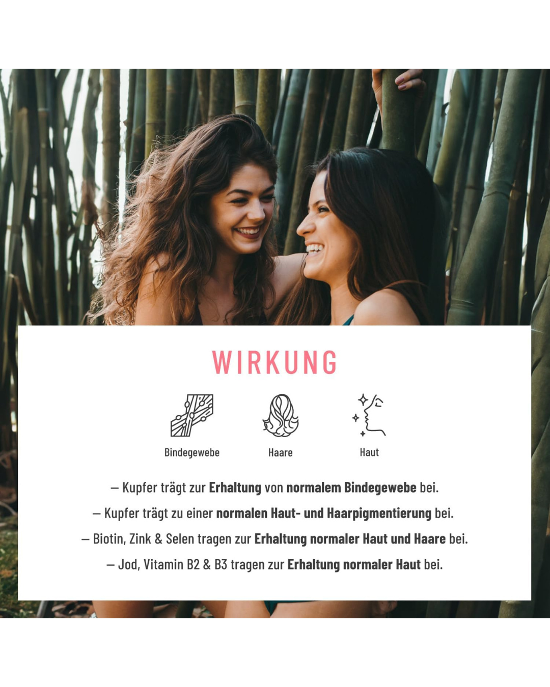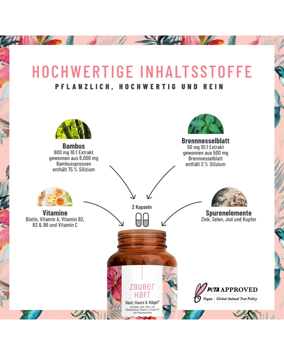 Bambussprossen-Extrakt 10:1 (Bambusa arundinacea, enthält 75 % Siliciumdioxid), Reismehl, Überzugsmittel: Hydroxypropylmethylcellulose (pflanzliche Kapselhülle), Calcium-L-Ascorbat, Zinkgluconat, Brennnesselblatt-Extrakt 10:1 (Urtica dioica, enthält 2 % Siliciumdioxid), Nicotinamid, Kupfergluconat, Retinylacetat, Kaliumiodid, Pyridoxinhydrochlorid, Riboflavin, D-Biotin, Natriumselenit.