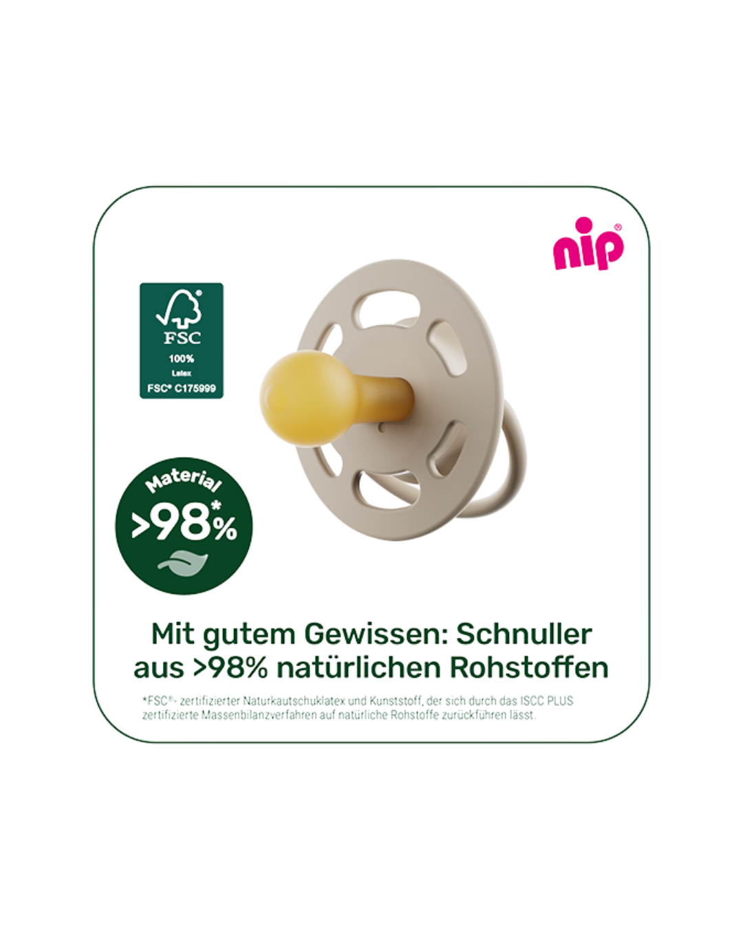 Hergestellt aus Naturkautschuklatex, welcher im Einzelfall allergische Reaktionen hervorrufen kann. Schnuller entspricht der Norm EN 1400 und ist von unabhängigen Instituten geprüft. Bei Beanstandungen bitte Schnuller mit Packung einsenden.