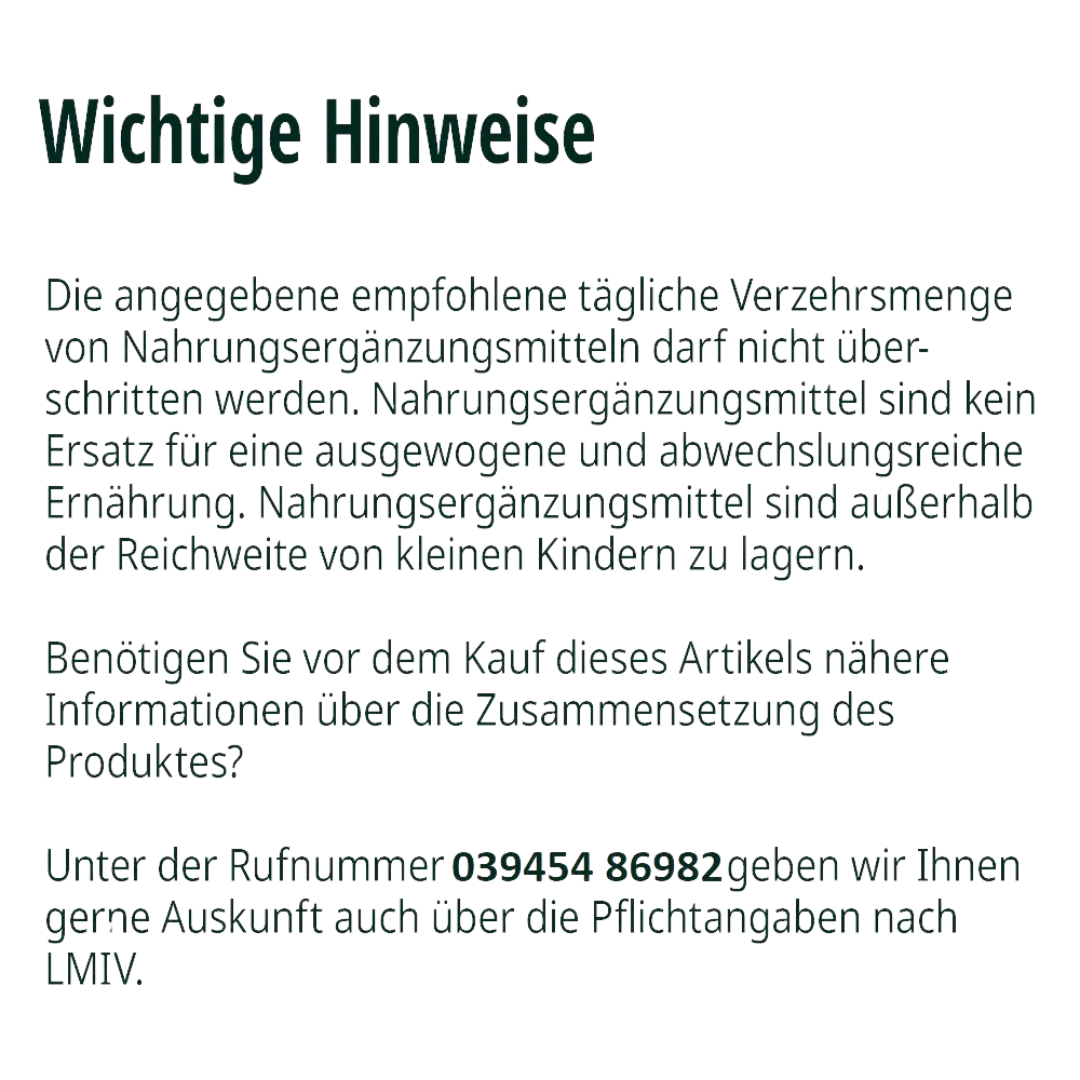 Nahrungsergänzungsmittel sind kein Ersatz für eine ausgewogene, abwechslungsreiche Ernährung und gesunde Lebensweise.