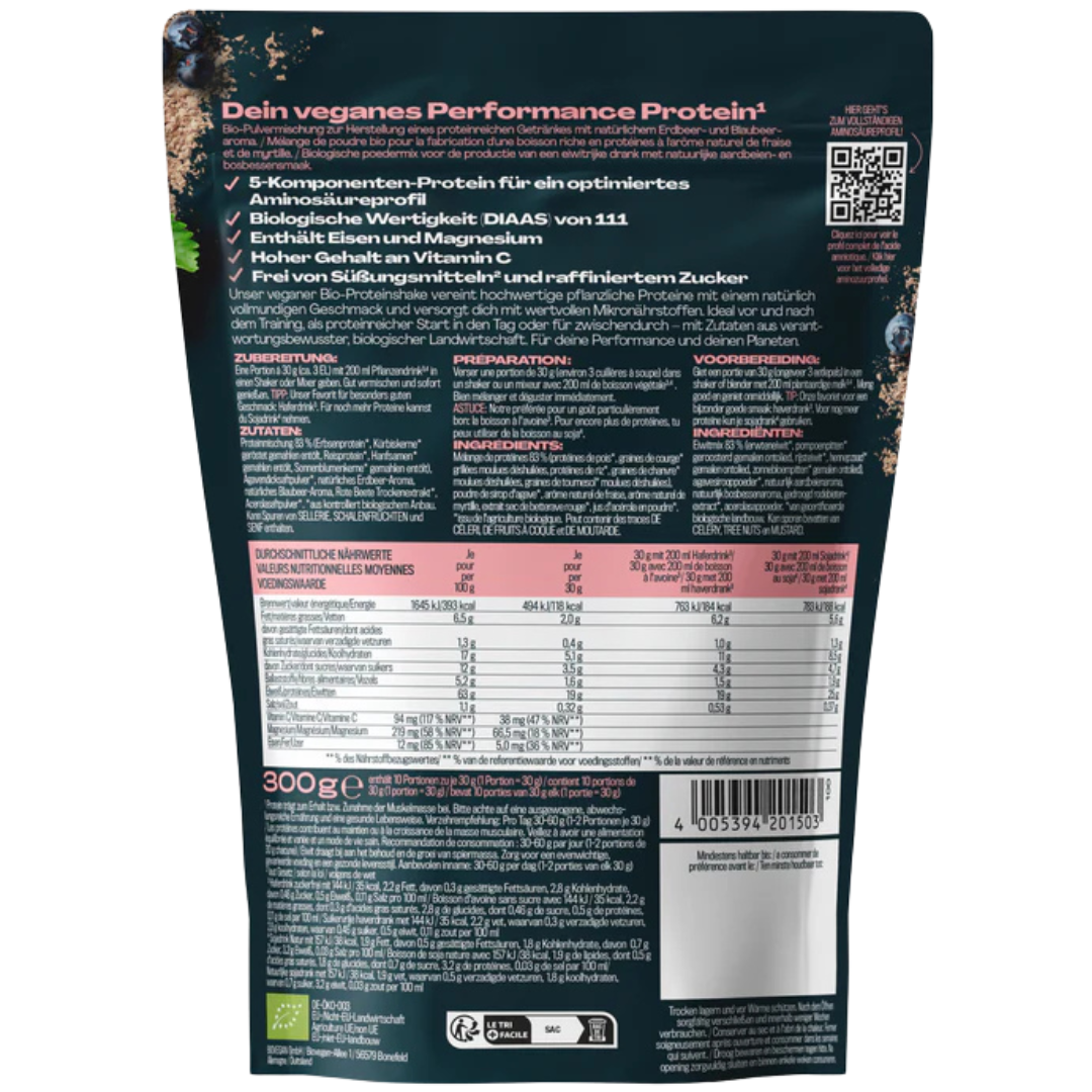 Proteinmischung 81,6 % (Erbsenprotein*, Kürbiskerne gemahlen* entölt, Reisprotein*, Hanfsamen gemahlen* entölt, Sonnenblumenkerne gemahlen* entölt), Agavendicksaftpulver*, natürliches Erdbeer-Aroma, natürliches Blaubeer-Aroma, Rote Beete Trockenextrakt*, Acerolasaftpulver*.