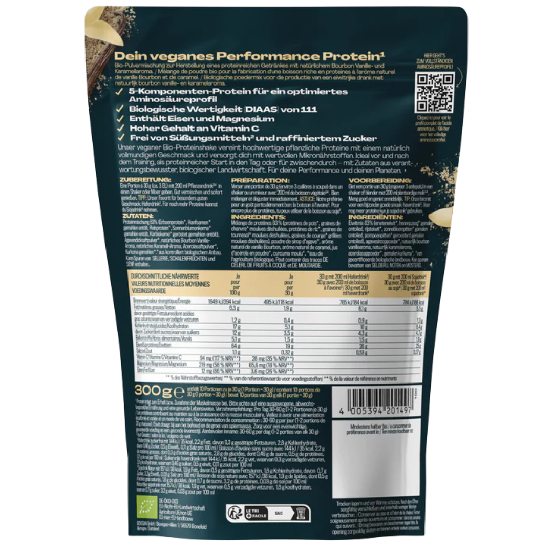 Proteinmischung 83,47 % (Erbsenprotein*, Hanfsamen gemahlen* entölt, Reisprotein*, Sonnenblumenkerne gemahlen* entölt, Kürbiskerne gemahlen* entölt), Agavendicksaftpulver*, natürliches Bourbon Vanille-Aroma, natürliches Karamell-Aroma, Acerolasaftpulver*, Kurkuma gemahlen*.