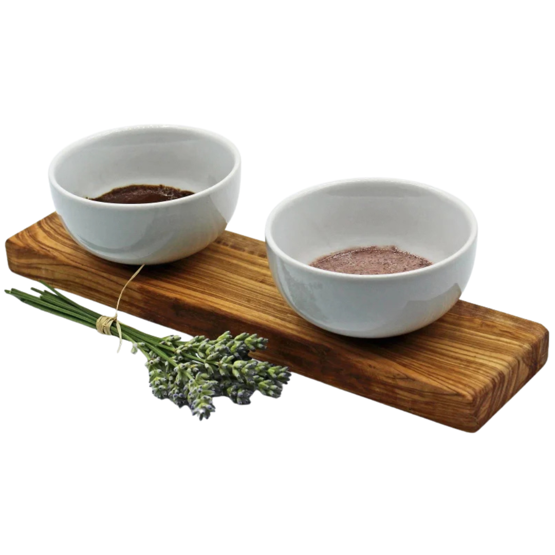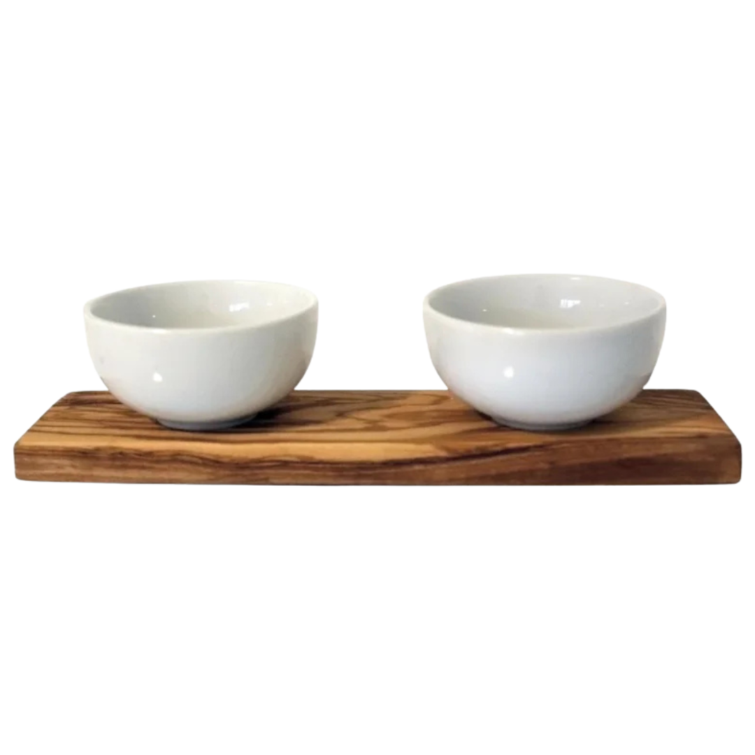 2 Porzellan-Schalen auf Olivenholz-Sockel