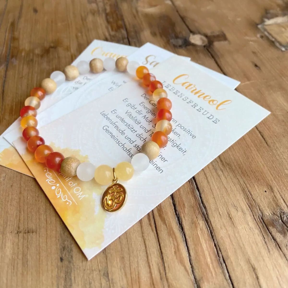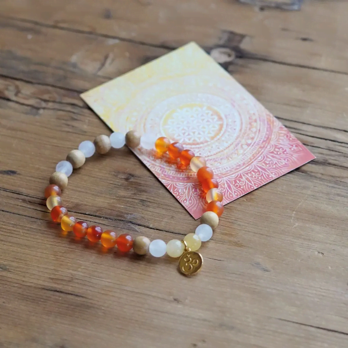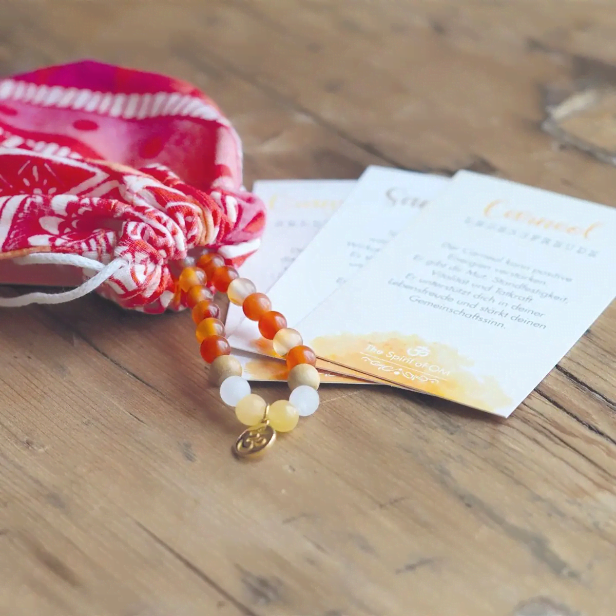 Erlebe mit unserem Carneol Armband eine Quelle der Energie und Lebensfreude. Dieses kunstvoll gefertigte Schmuckstück verbindet die belebende Kraft des Carneols mit der sanften Unterstützung des Orangencalcits und der beruhigenden Wärme des Sandelholzes, um ein Accessoire von tiefer Bedeutung und Schönheit zu schaffen.
