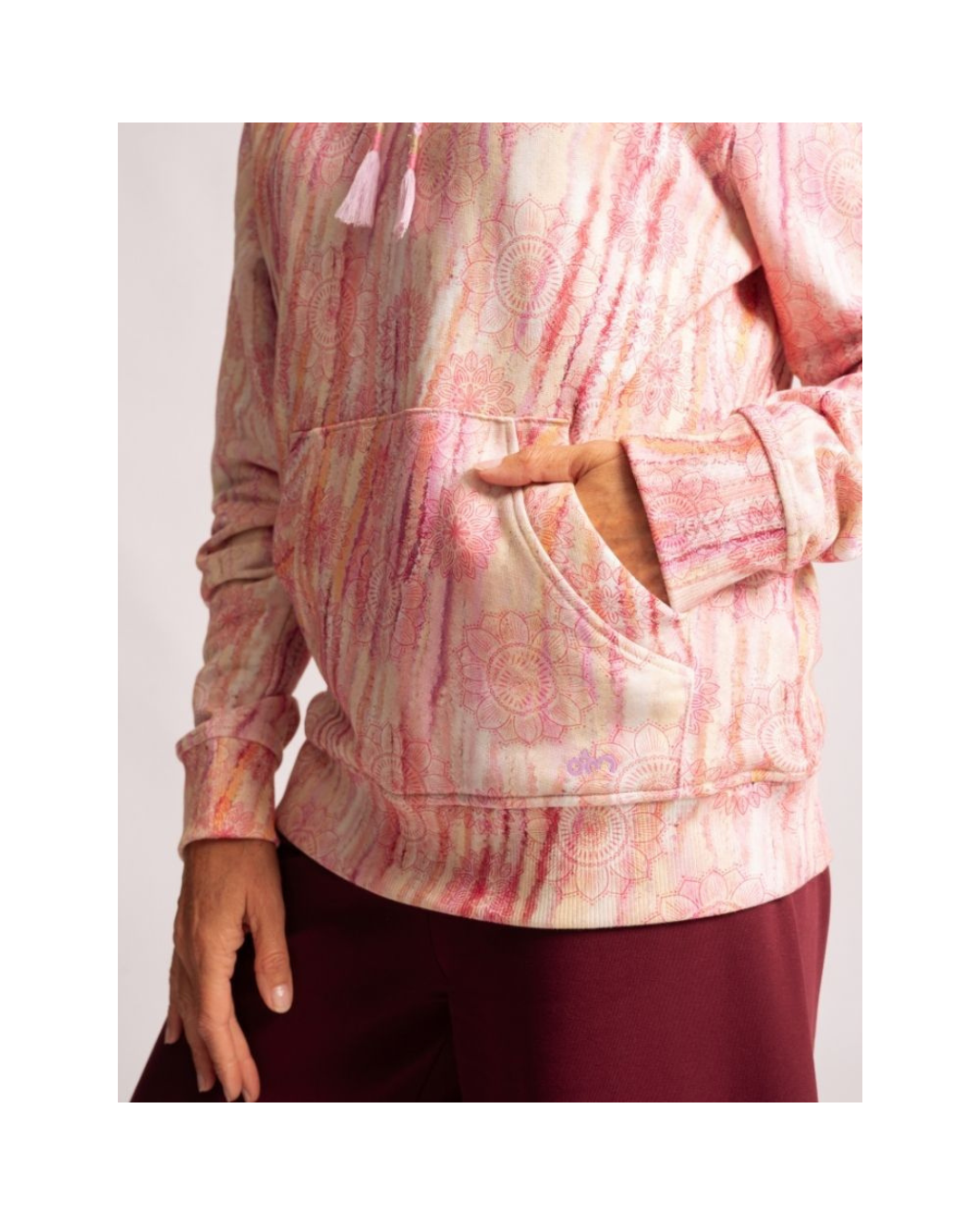 Der Farbton Patala – inspiriert von zarten Rosenblättern – verleiht dem Hoodie eine sanfte, harmonische Ausstrahlung. In den Stoff eingearbeiteter mikrofeiner Turmalin soll dazu beitragen, Ruhe und Gelassenheit zu unterstützen. Bedruckte Rippbündchen und eine dezente Spirit of OM-Stickerei an der Tasche unterstreichen die hochwertige Verarbeitung und verleihen dem Hoodie seine besondere Ästhetik.