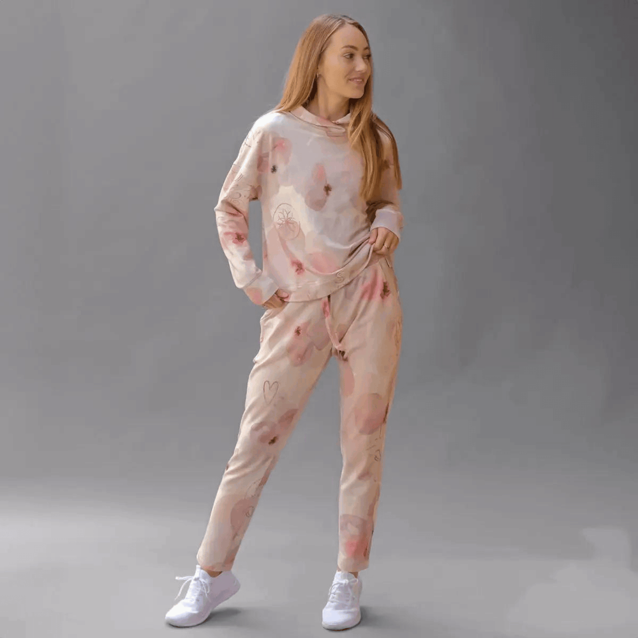 Die Lounge Hose Joy besticht durch ihren lockeren Schnitt, der dir uneingeschränkte Bewegungsfreiheit bietet und dich mit einem coolen, relaxten Look umschmeichelt. Der florale Aquarell-Print lädt zur Inspiration ein und verleiht deinem Leben eine künstlerische Note. Diese Hose ist perfekt für entspannte Tage zu Hause, gemütliche Abende oder auch als stilvolle Loungewear für den Alltag.