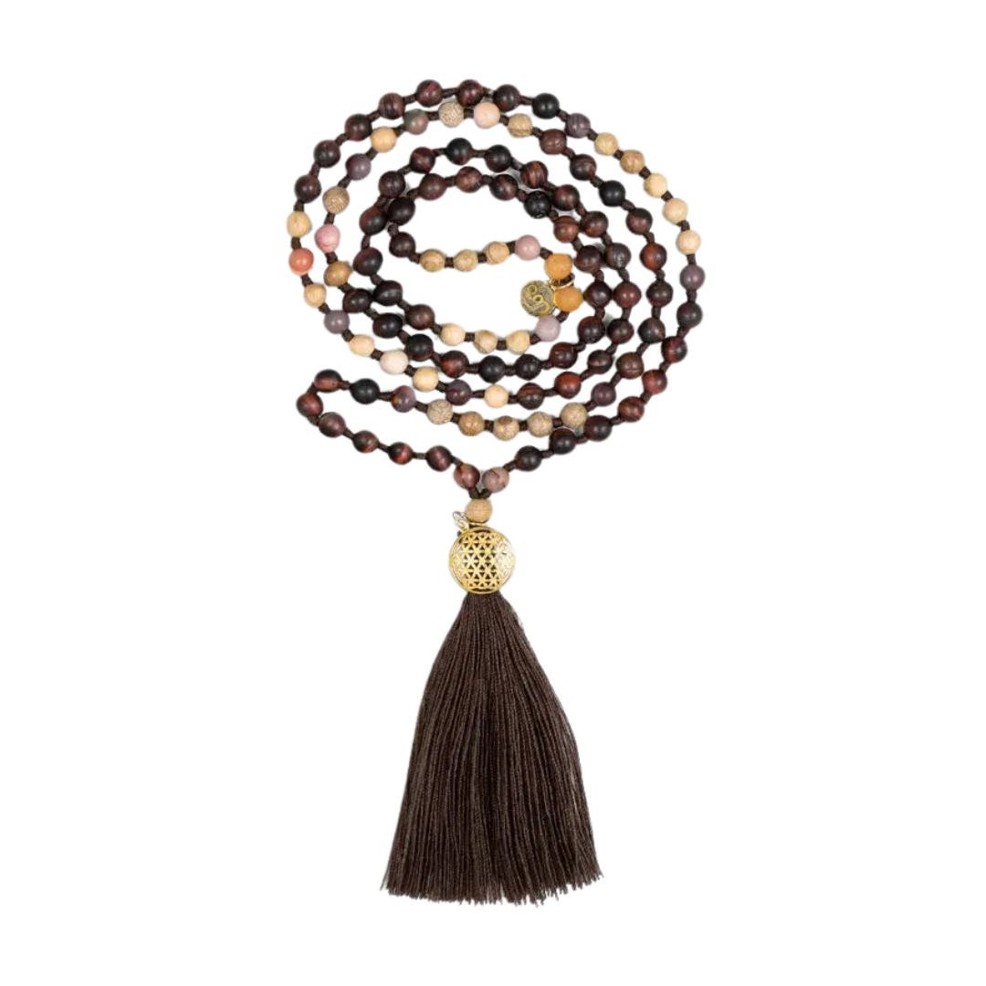 Das Tigerauge, der Hauptstein dieser Mala, steht für Mut und Entschlossenheit. Es stärkt das Vertrauen in die eigenen Fähigkeiten und hilft dabei, Herausforderungen klar zu meistern. Zusammen mit den Mookaite-Perlen, die für Erdung und Widerstandskraft stehen, und den Sandelholz-Perlen, die für Stabilität sorgen, unterstützt dich diese Mala im Alltag und in der Meditation.